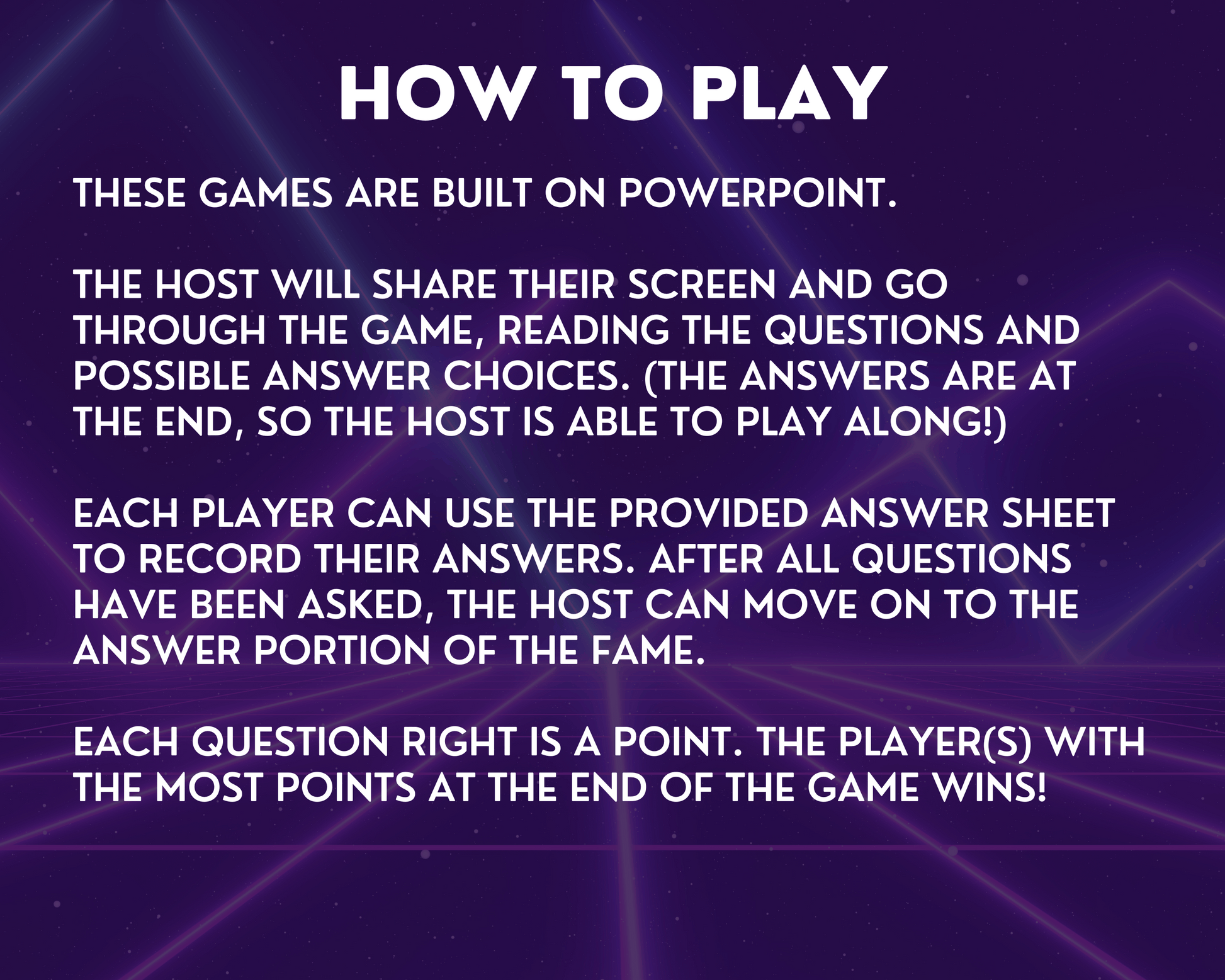 These games are built on PowerPoint and include music and animations that will get your party started! These games can be played virtually or in-person!
