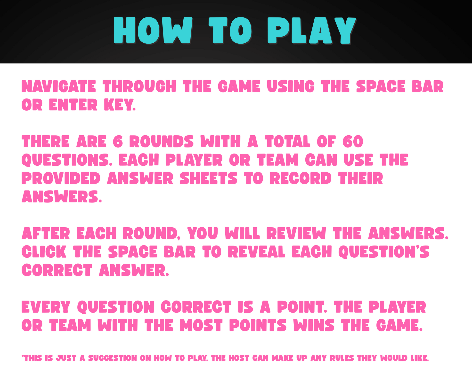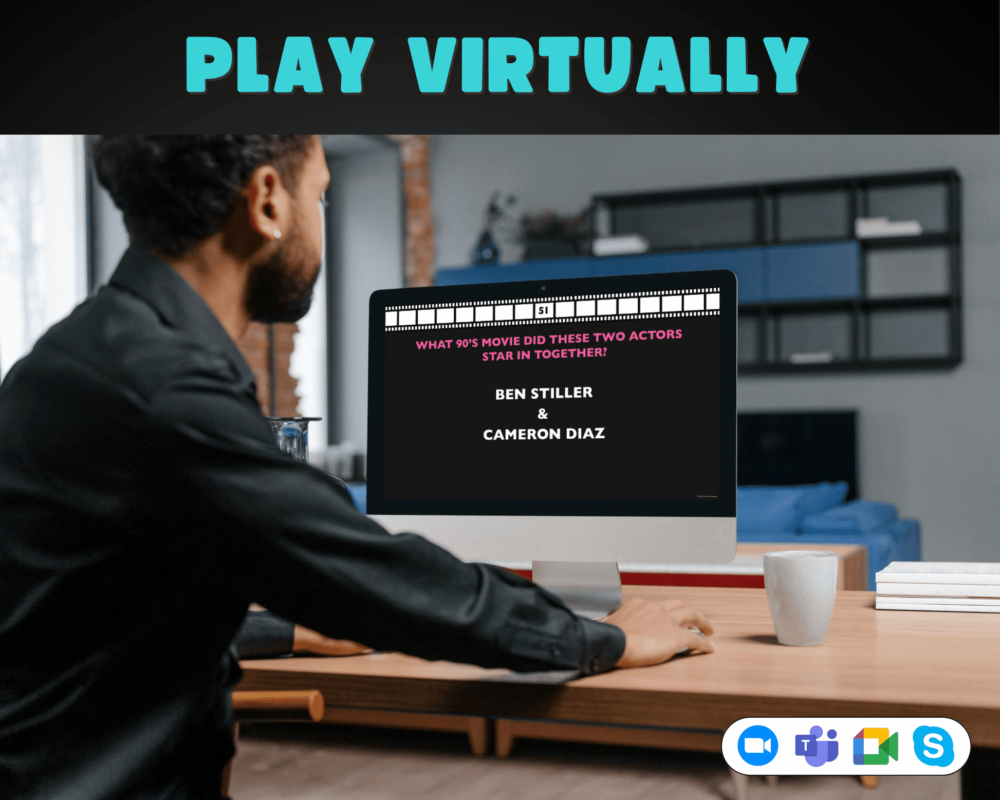 This game is perfect for 90’s themed birthday parties, in-person or virtual trivia nights, office team building, and more!