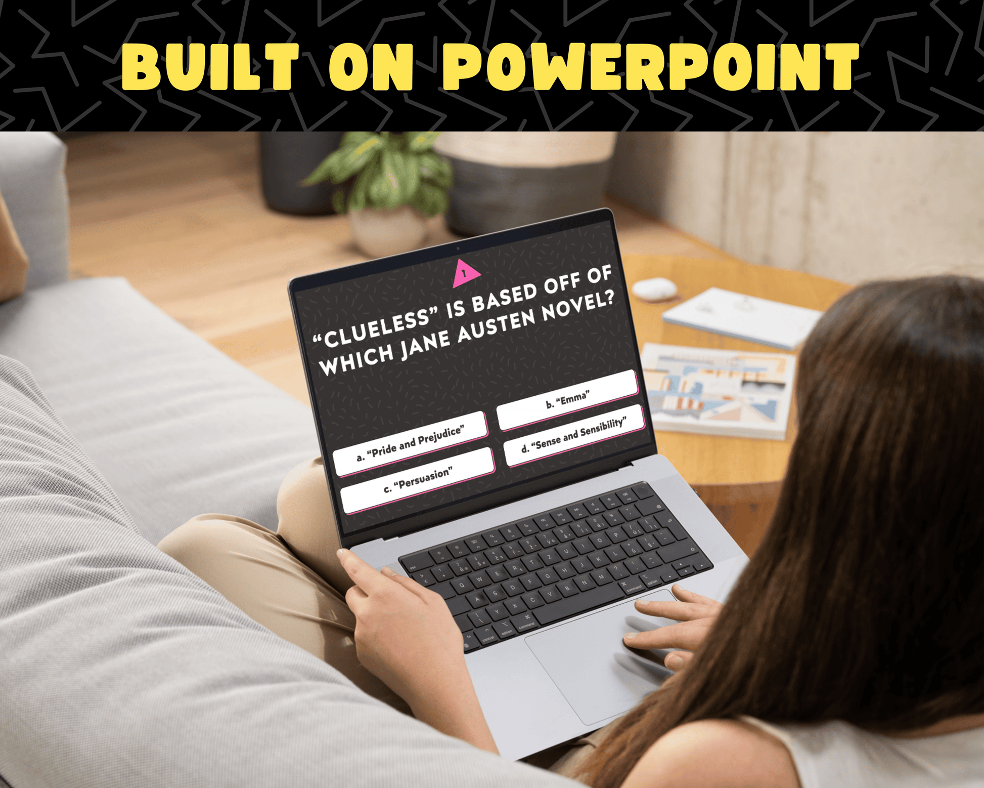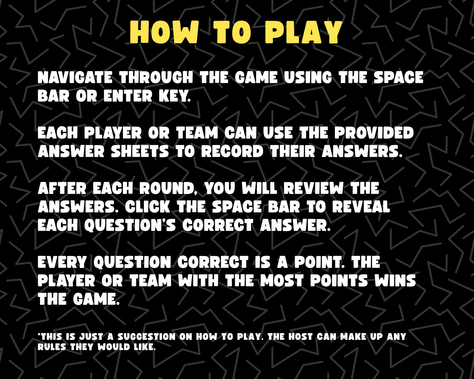 These games are built in PowerPoint and each come equipped with music, pictures and animations that will get everyone in the 90's spirit! Perfect for 90's themed birthday parties, in-person trivia nights and more!
