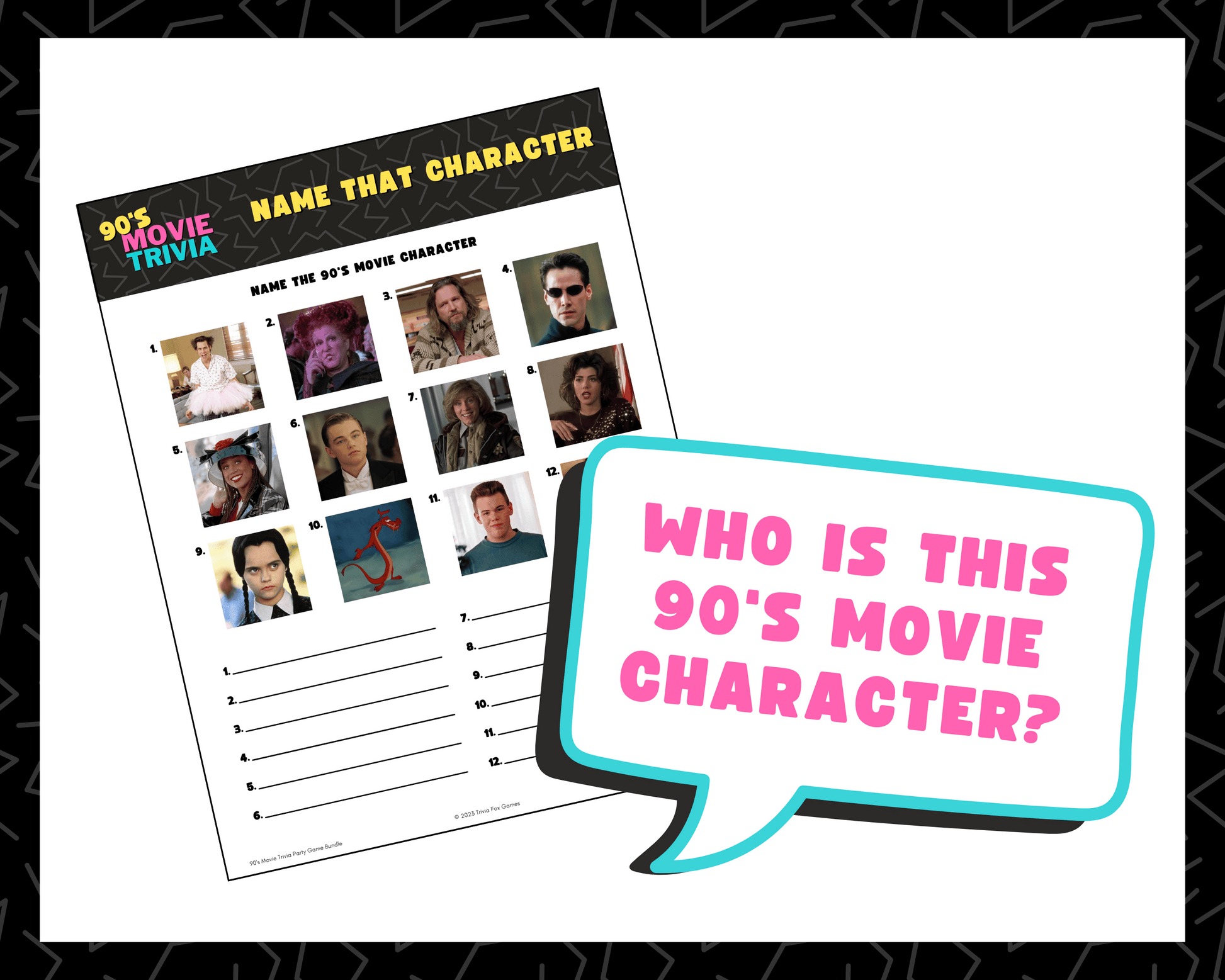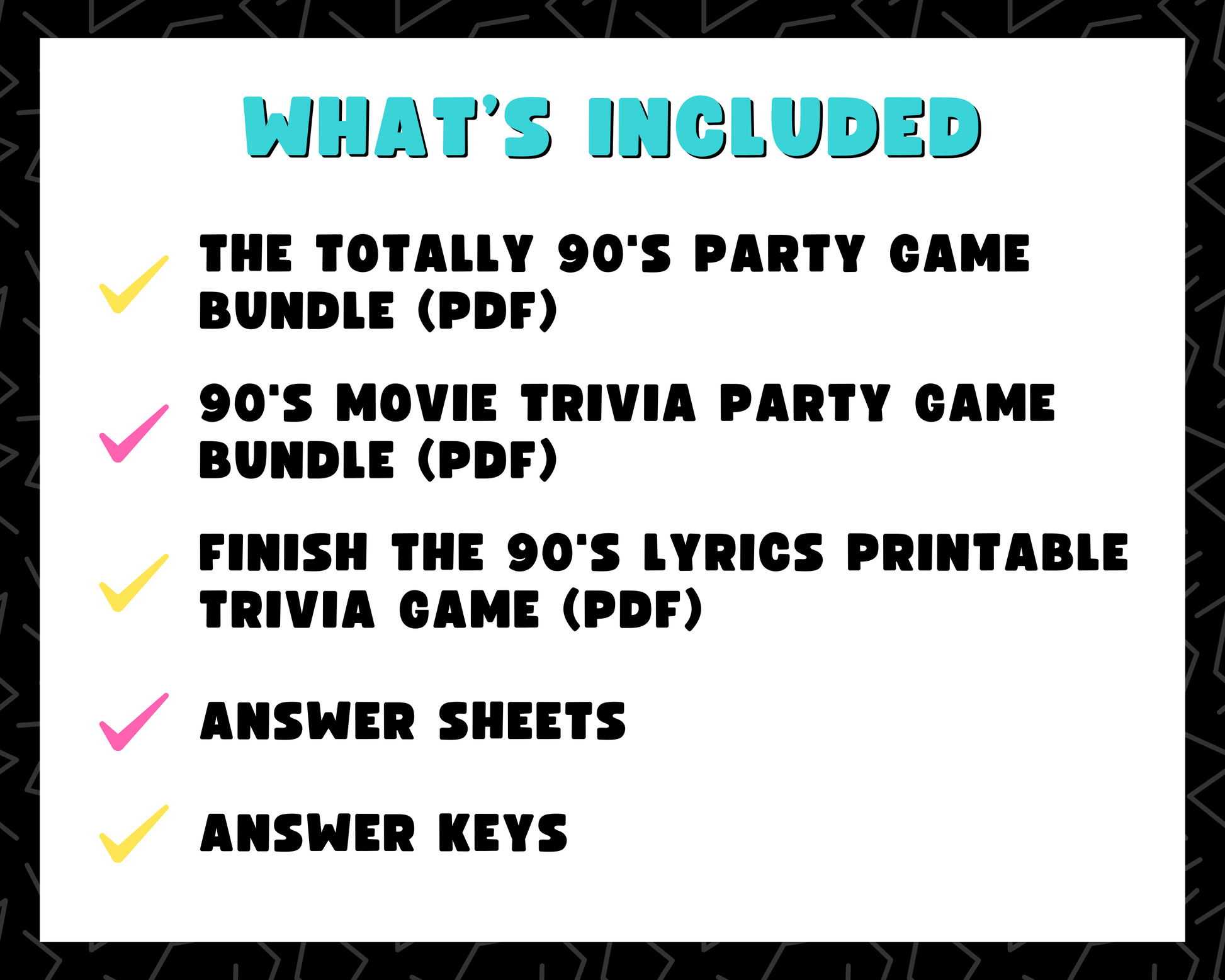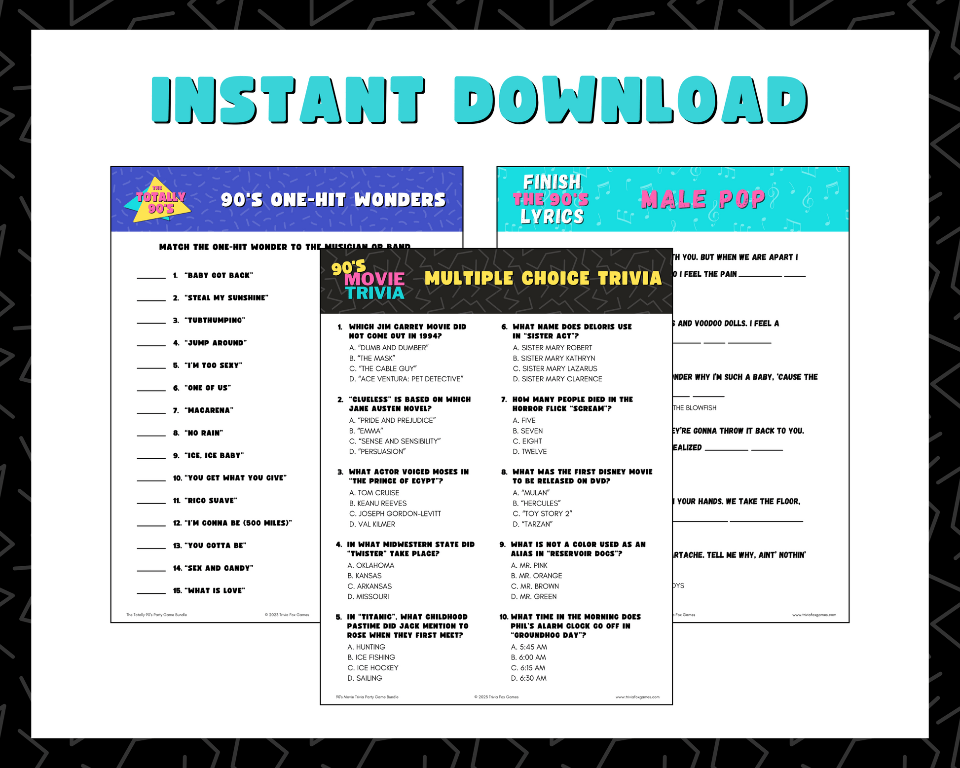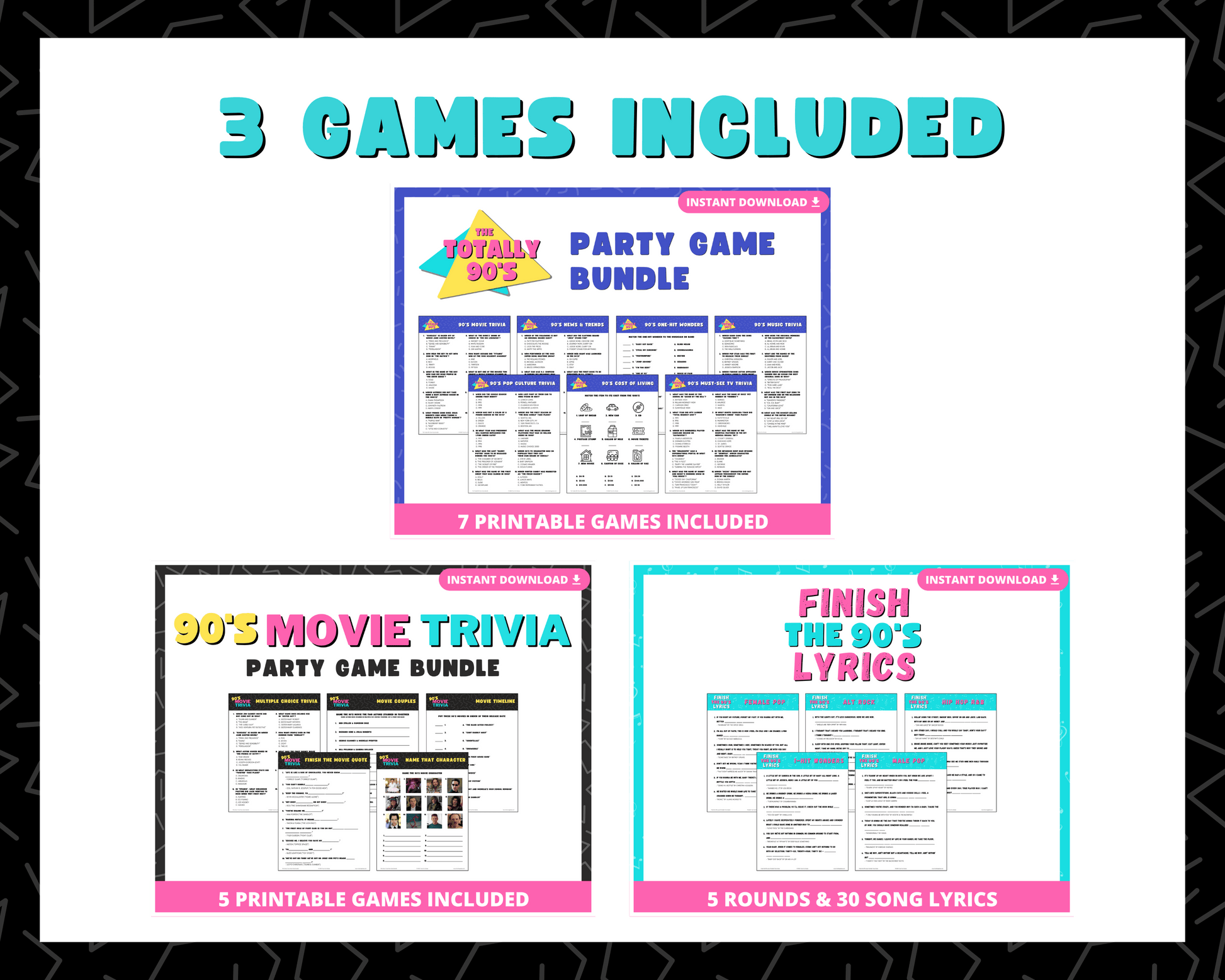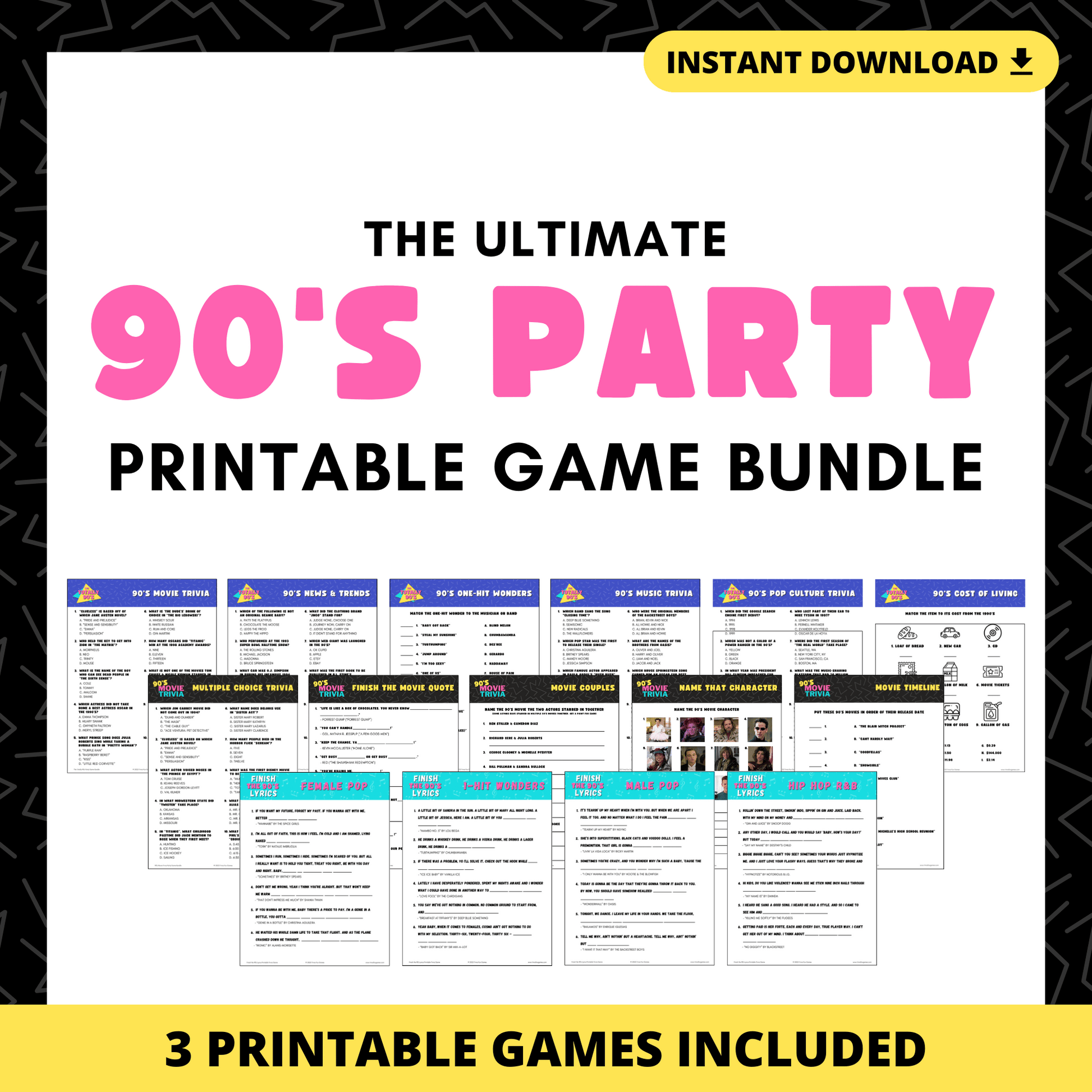 Take it back to the 90's with this printably party game bundle of THREE fun trivia games that will test your knowledge on the movies, music, trends and more of the 1990's! These games are perfect for 90's themed birthday parties, in-person trivia nights and more!