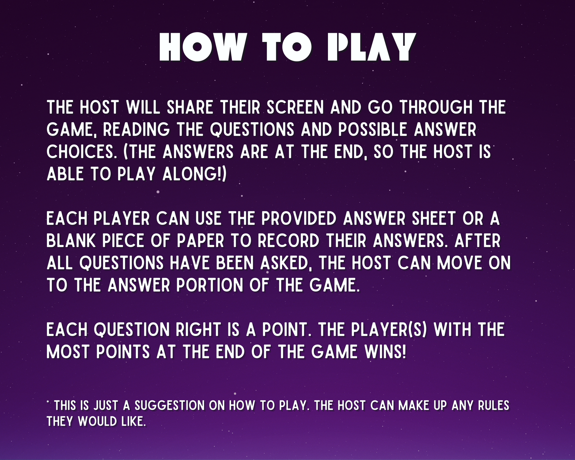 This game is built on PowerPoint and includes music and animations that will get everyone in the 80’s spirit! So go grab your best mullet wig, some neon sunglasses, and a pair of leg warmers and play this 80’s Trivia Game at your next party!