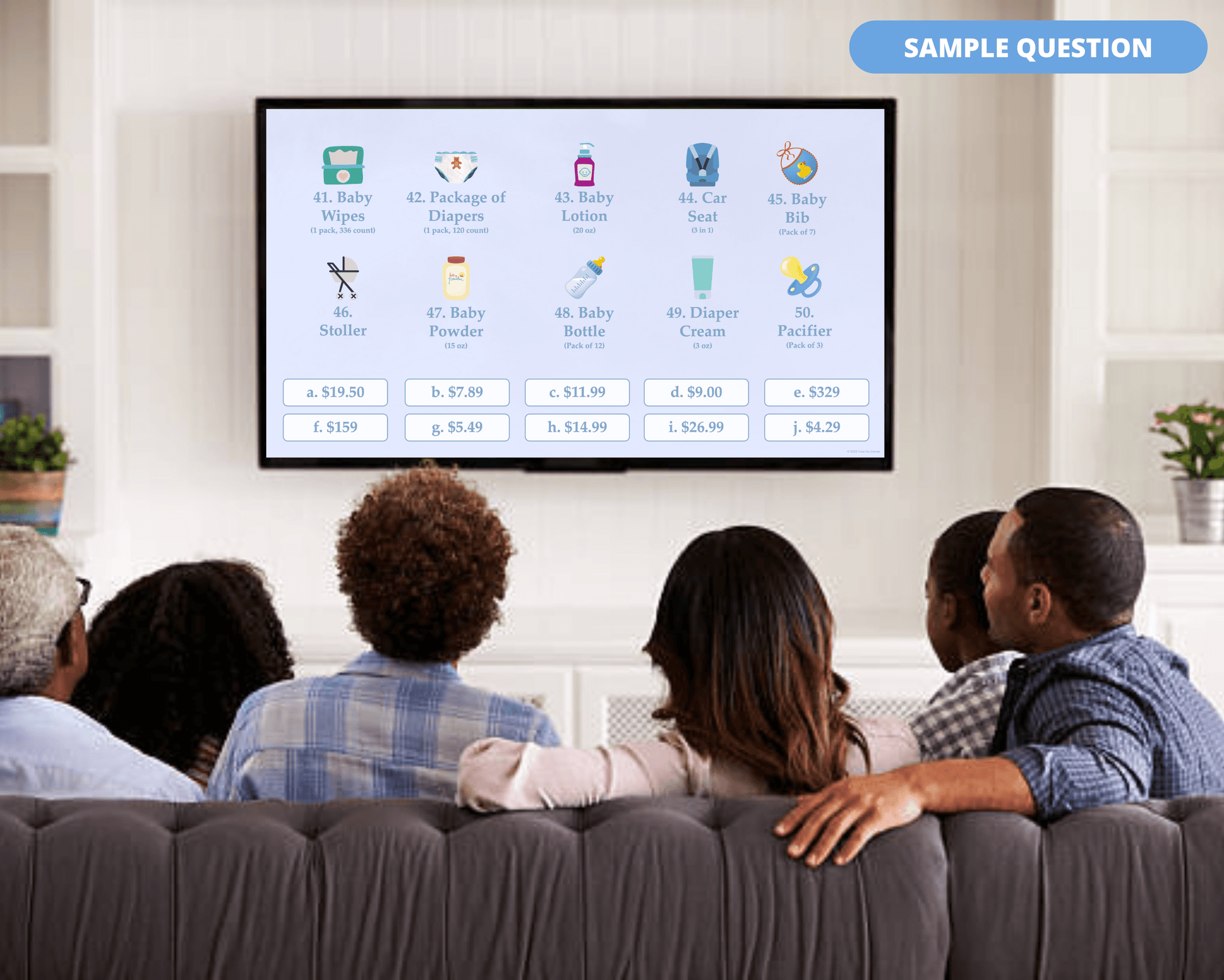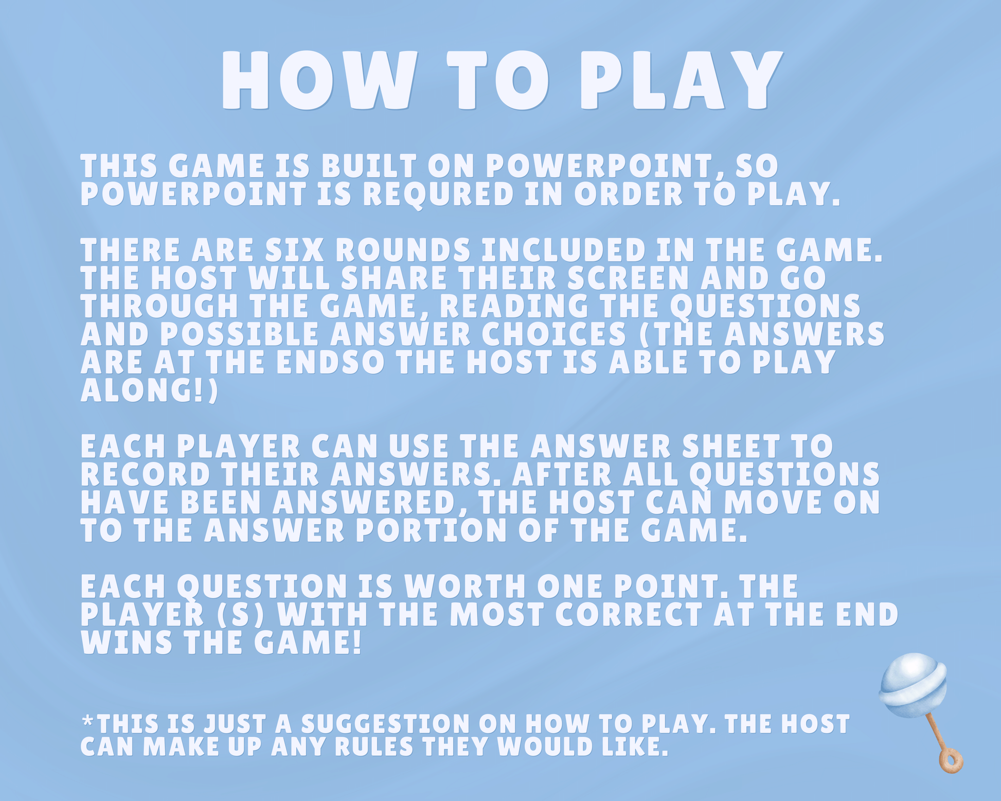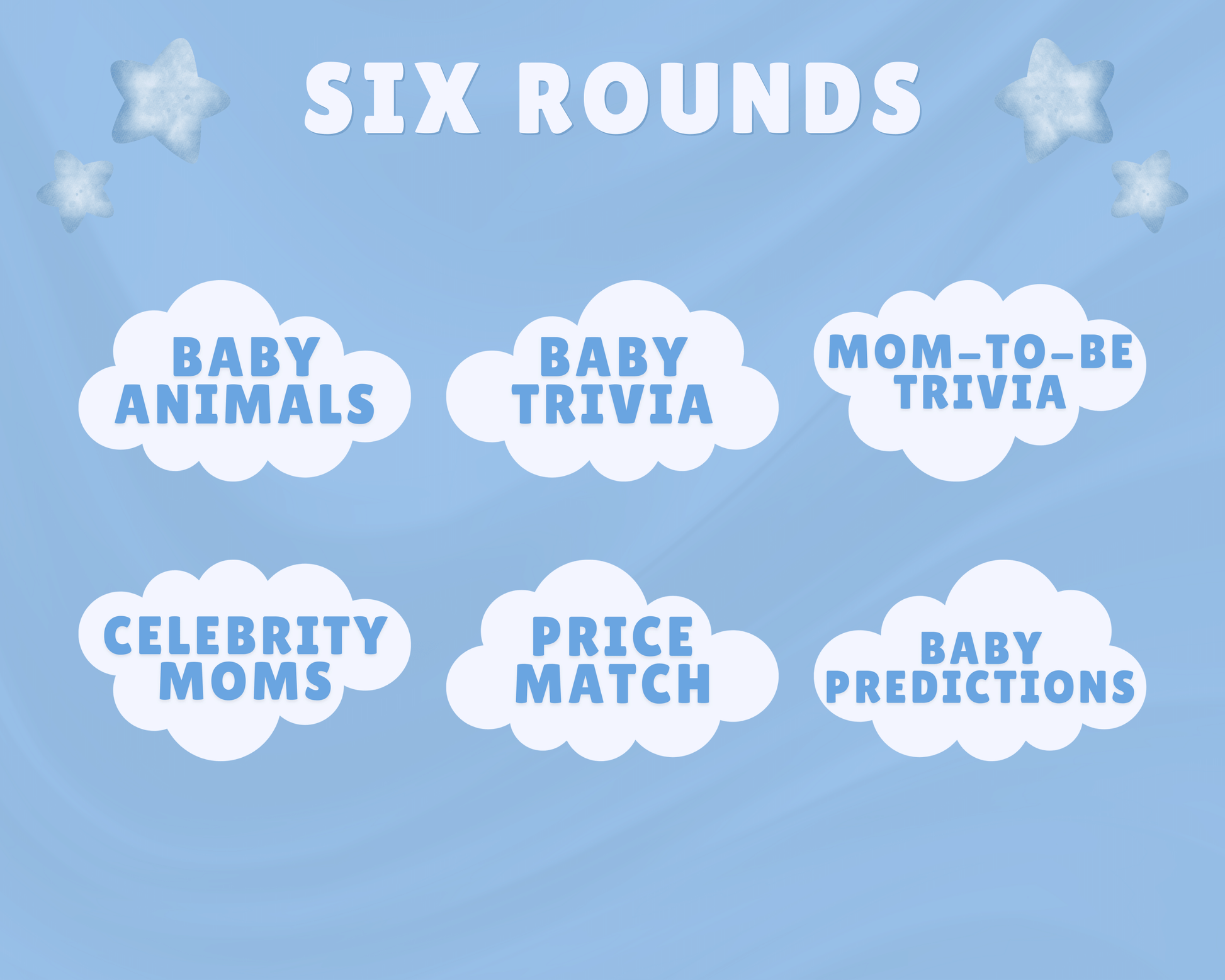 The Baby Shower Digital Party Game (Boy Edition) is the perfect activity to use at your next Baby Shower! With 6 rounds and over 50 questions, your guests will be having a blast trying to answer questions about the mom-to-be, baby animals, and much more!