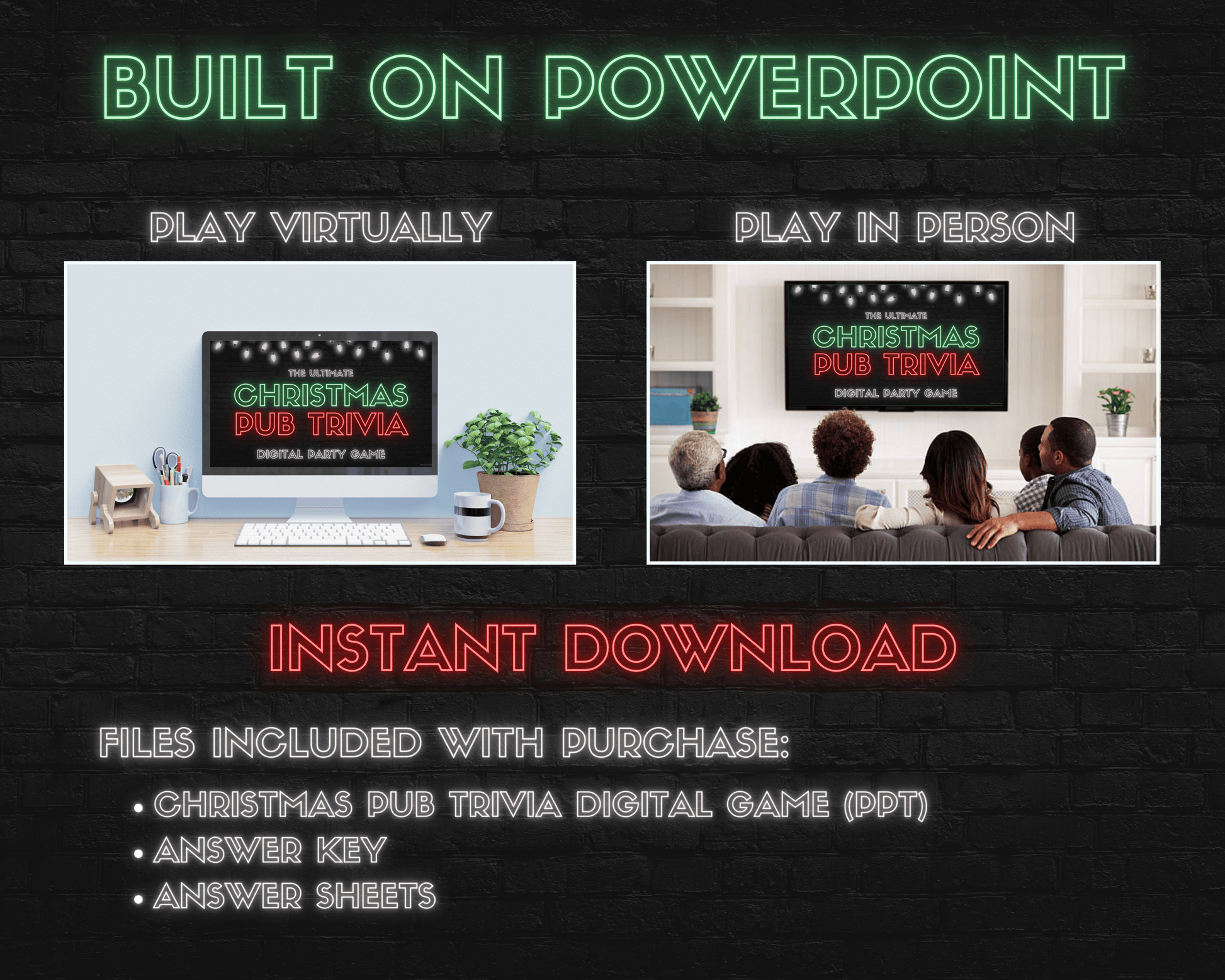 The Digital Christmas Pub Trivia Game is the perfect way to test your knowledge on all things Christmas! This game is built on PowerPoint and can be played virtually or in-person!