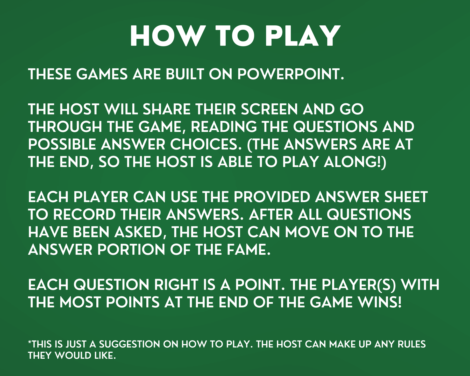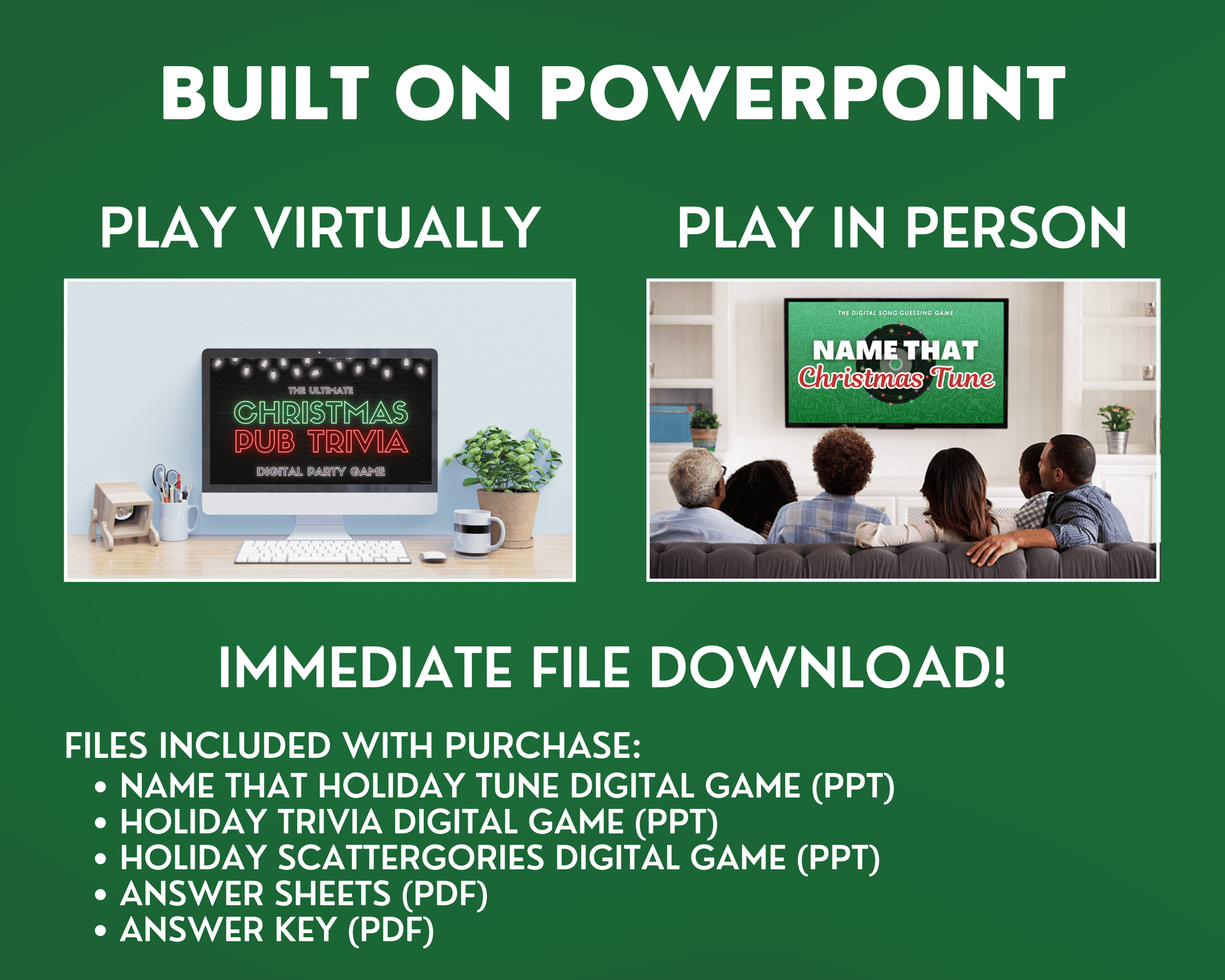 These games are built on PowerPoint and include music and animations that will get you in the holiday spirit! These games can be played virtually or in-person!