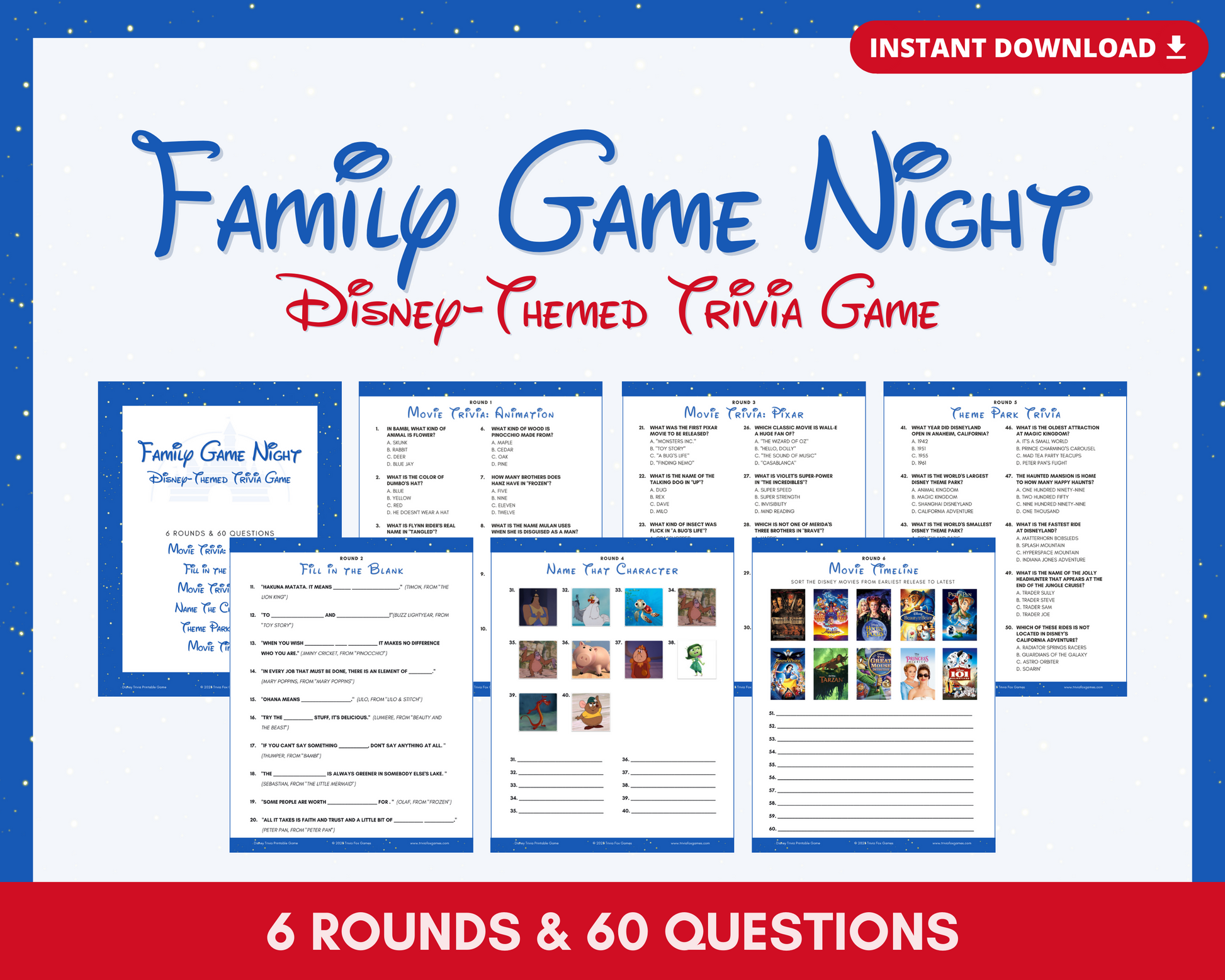 This Printable Trivia game will test your knowledge on your favorite family movies, characters, and more! ! Receive your files instantly to print out and challenge your friends to a game of trivia!