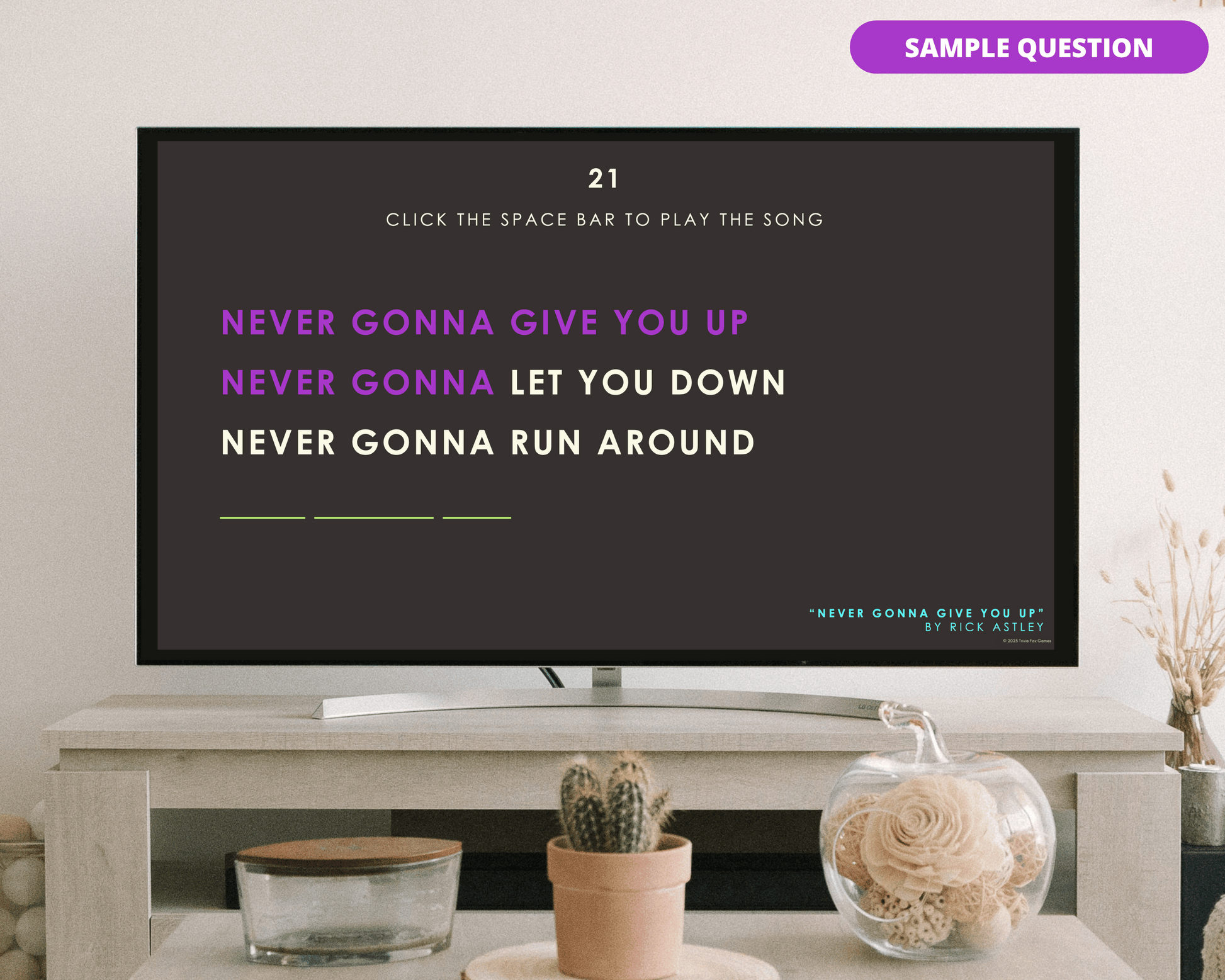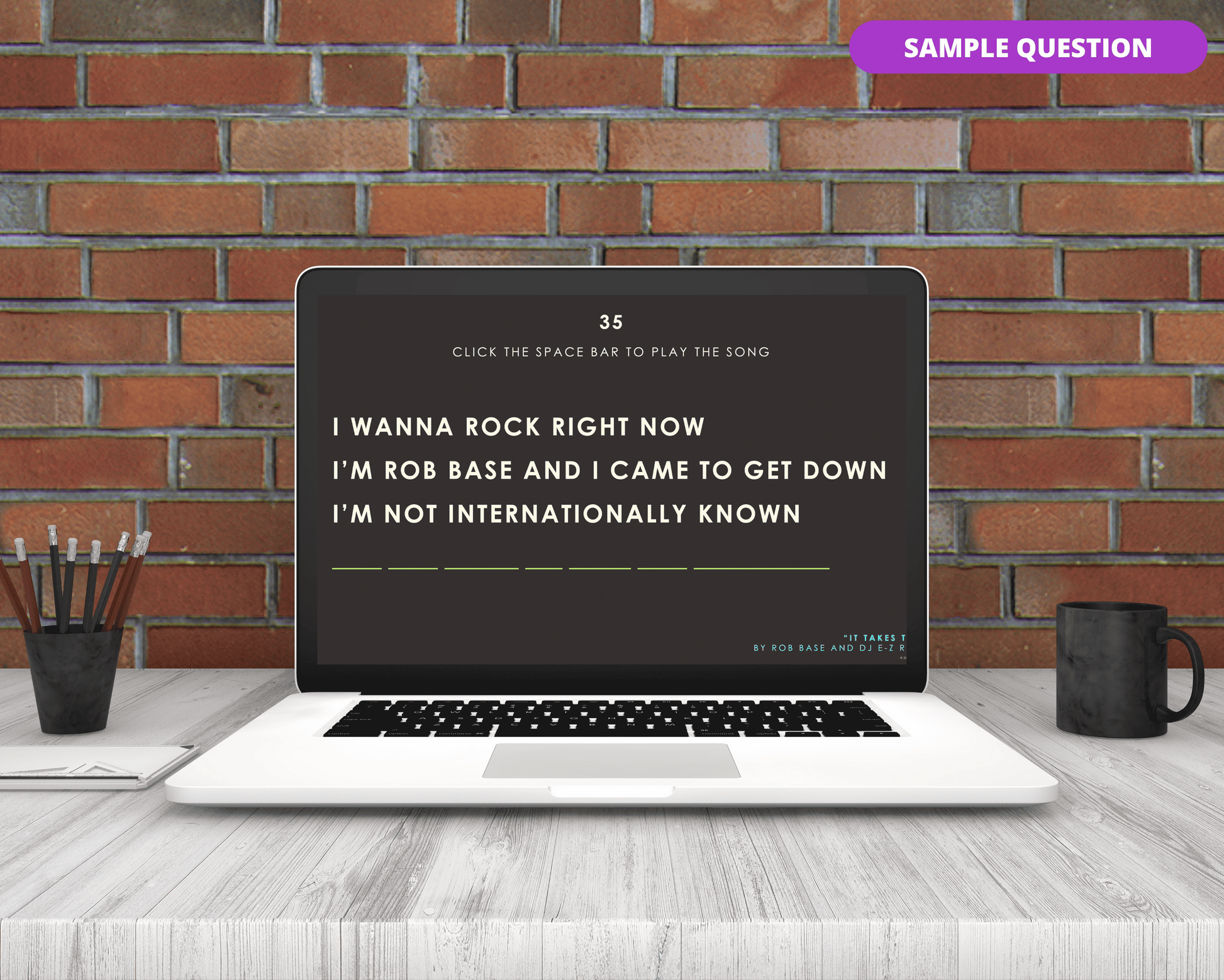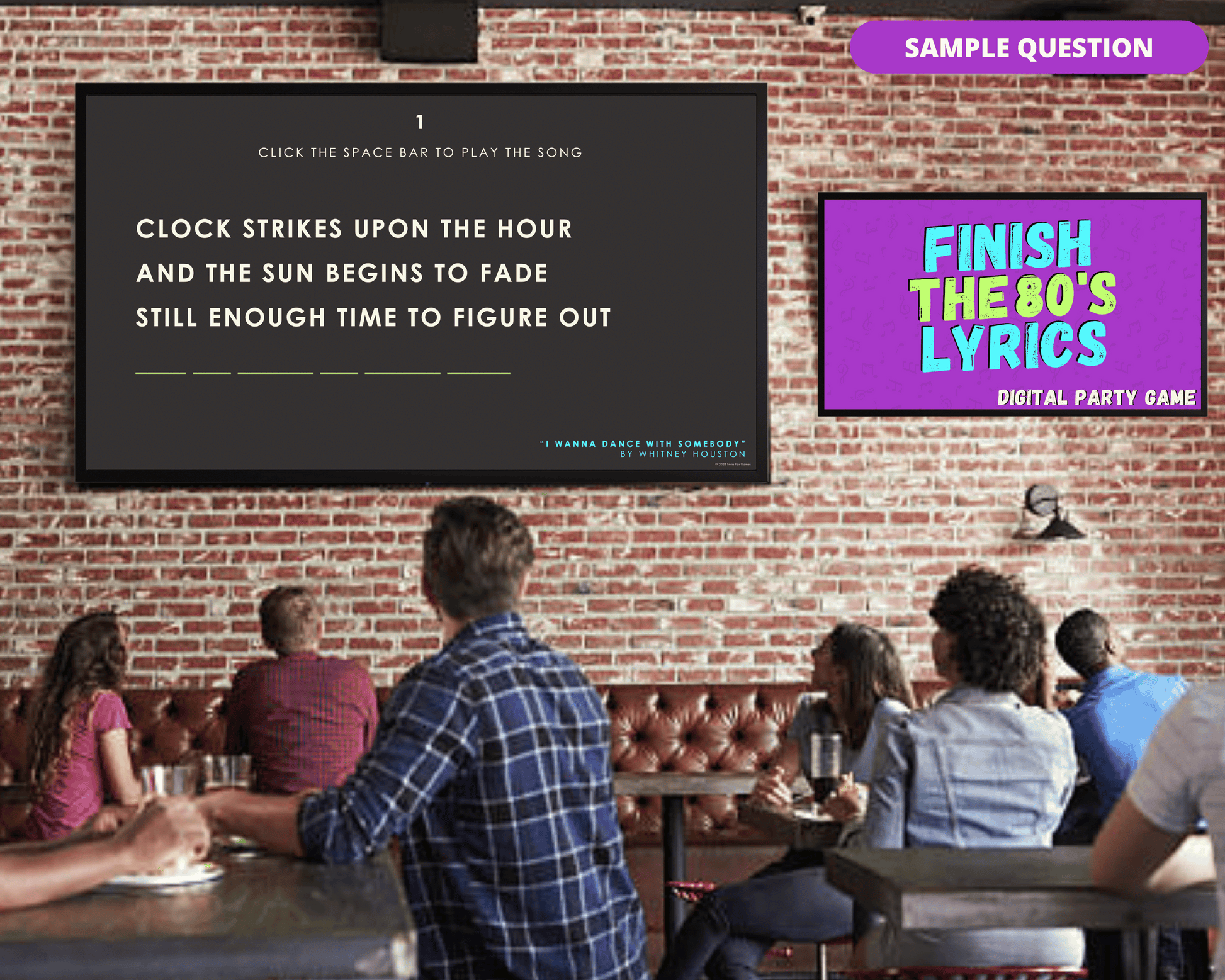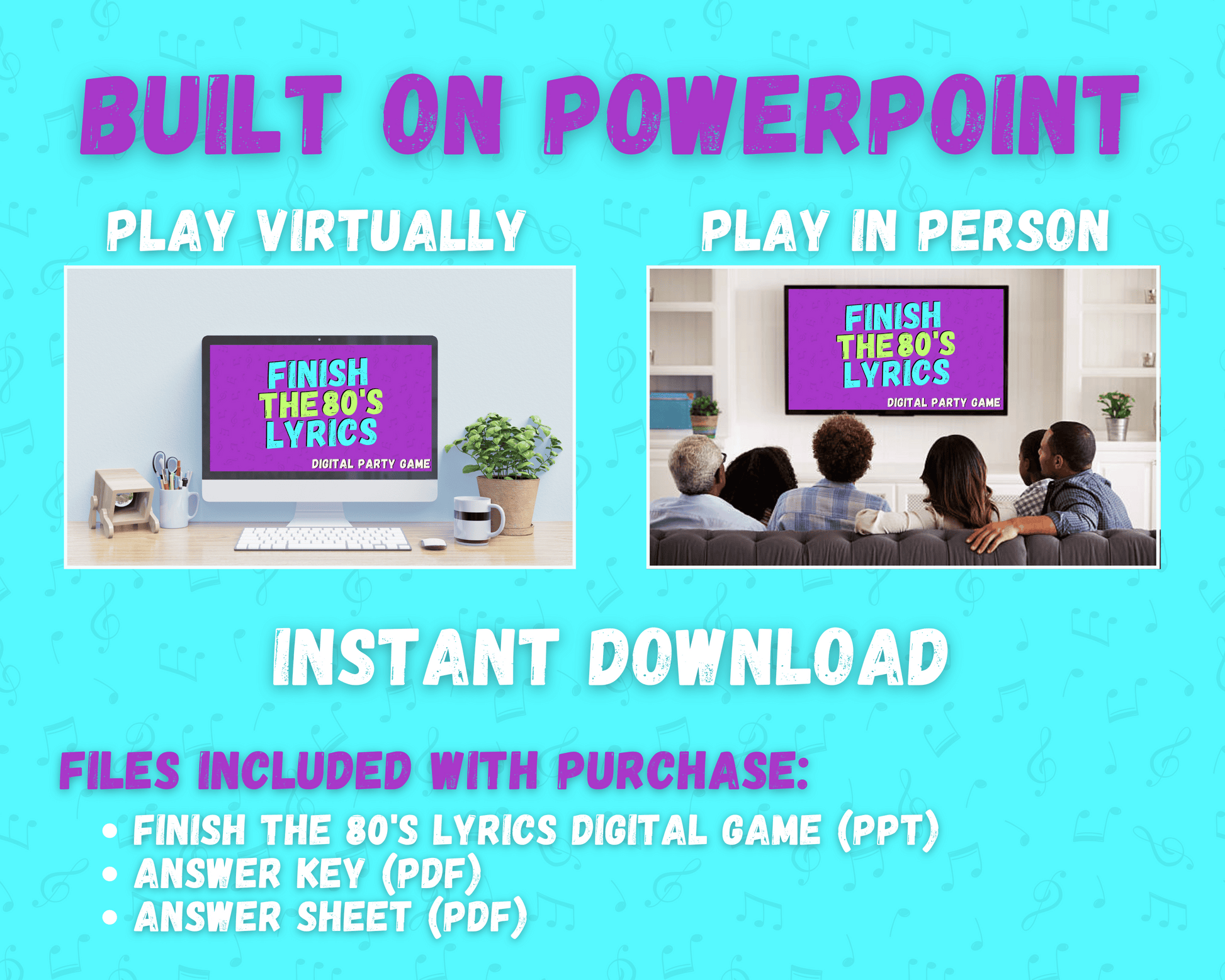 The Finish the 80's Lyrics Digital Game is the perfect game to test your 80's music knowledge! With 40 songs, you and your friends, family, and colleagues will have a blast trying to finish the lyric!