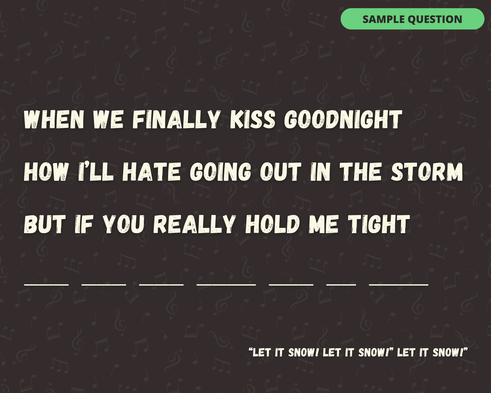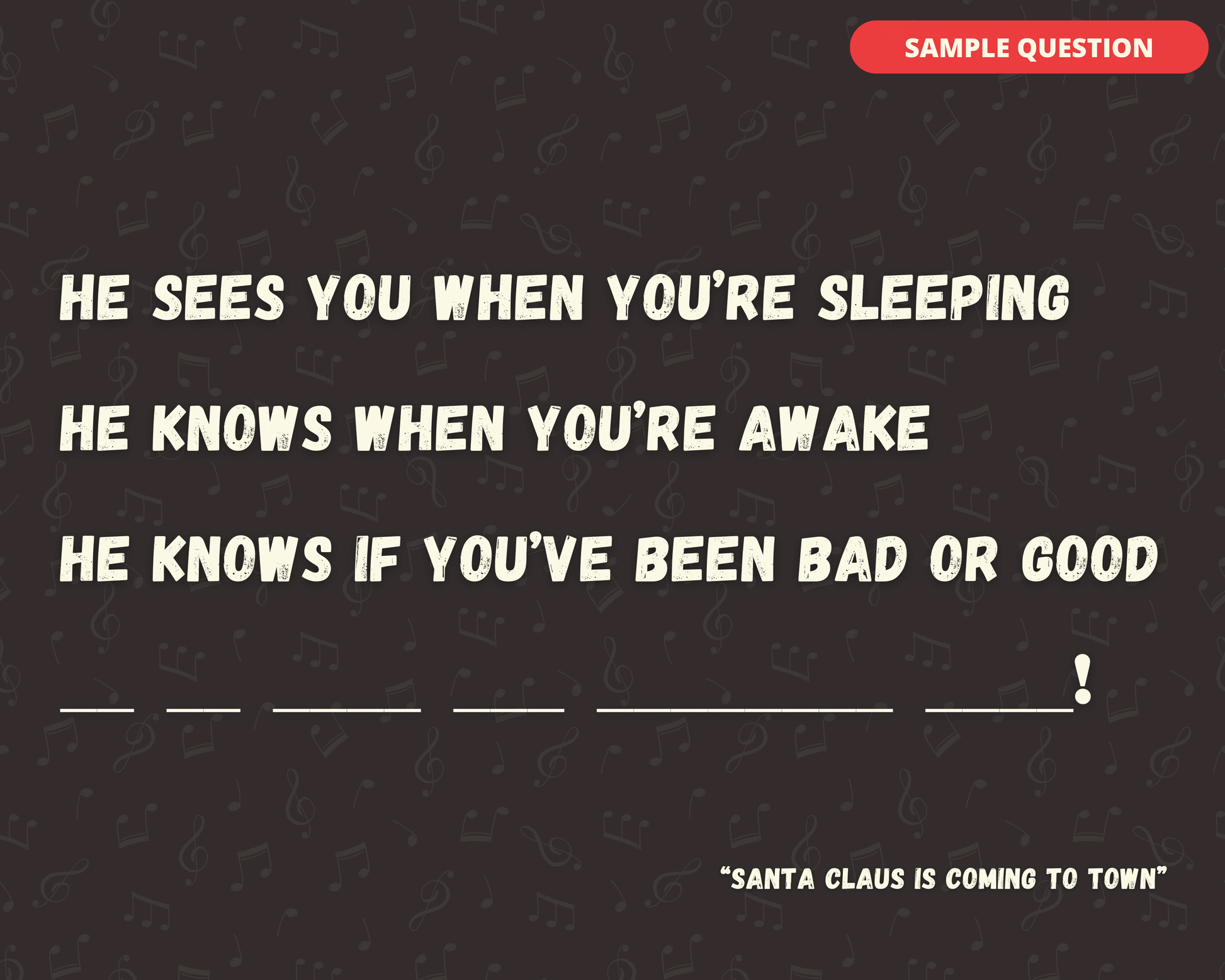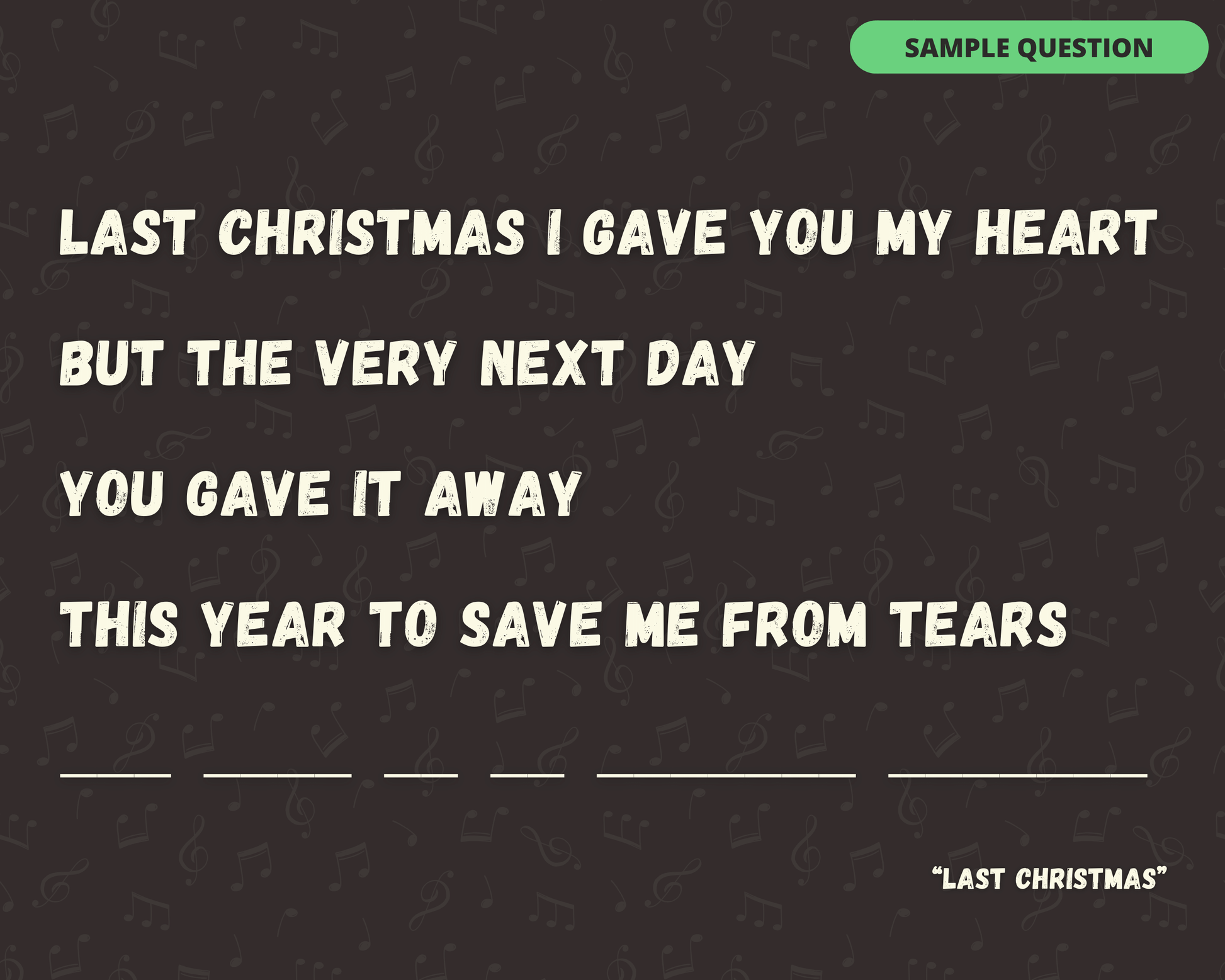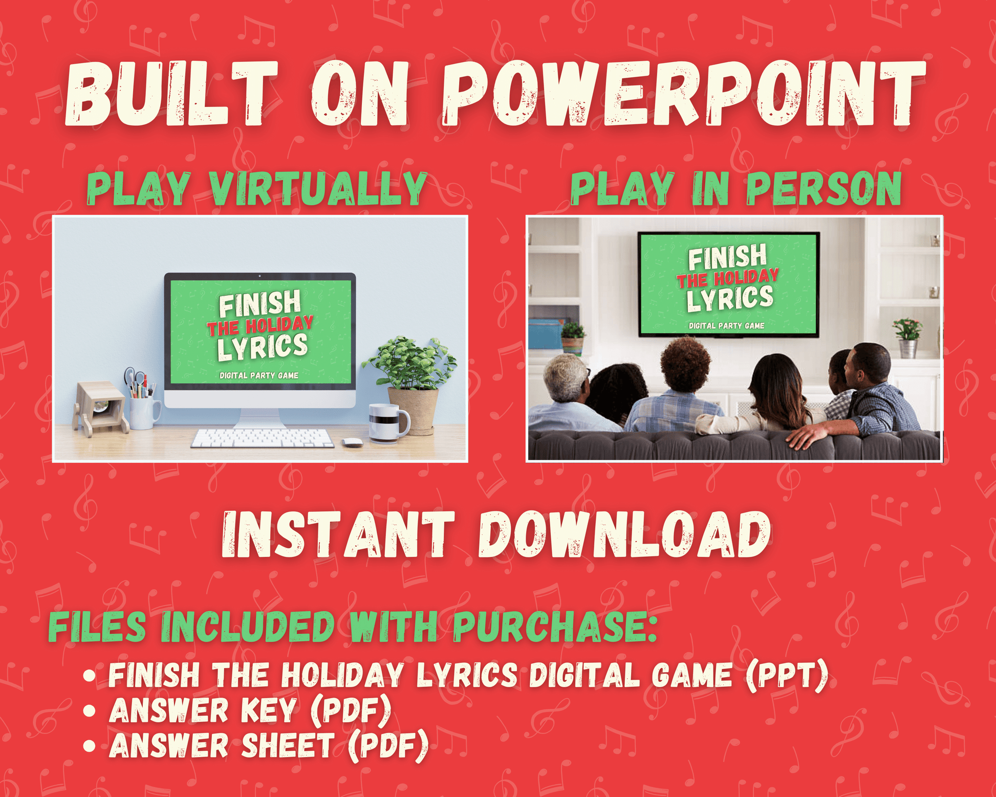 The Finish the Holiday Lyric Digital Game is the perfect game to test your Christmas/Holiday music knowledge! With 30 songs, you and your friends, family, and colleagues will have a blast trying to finish the lyric!