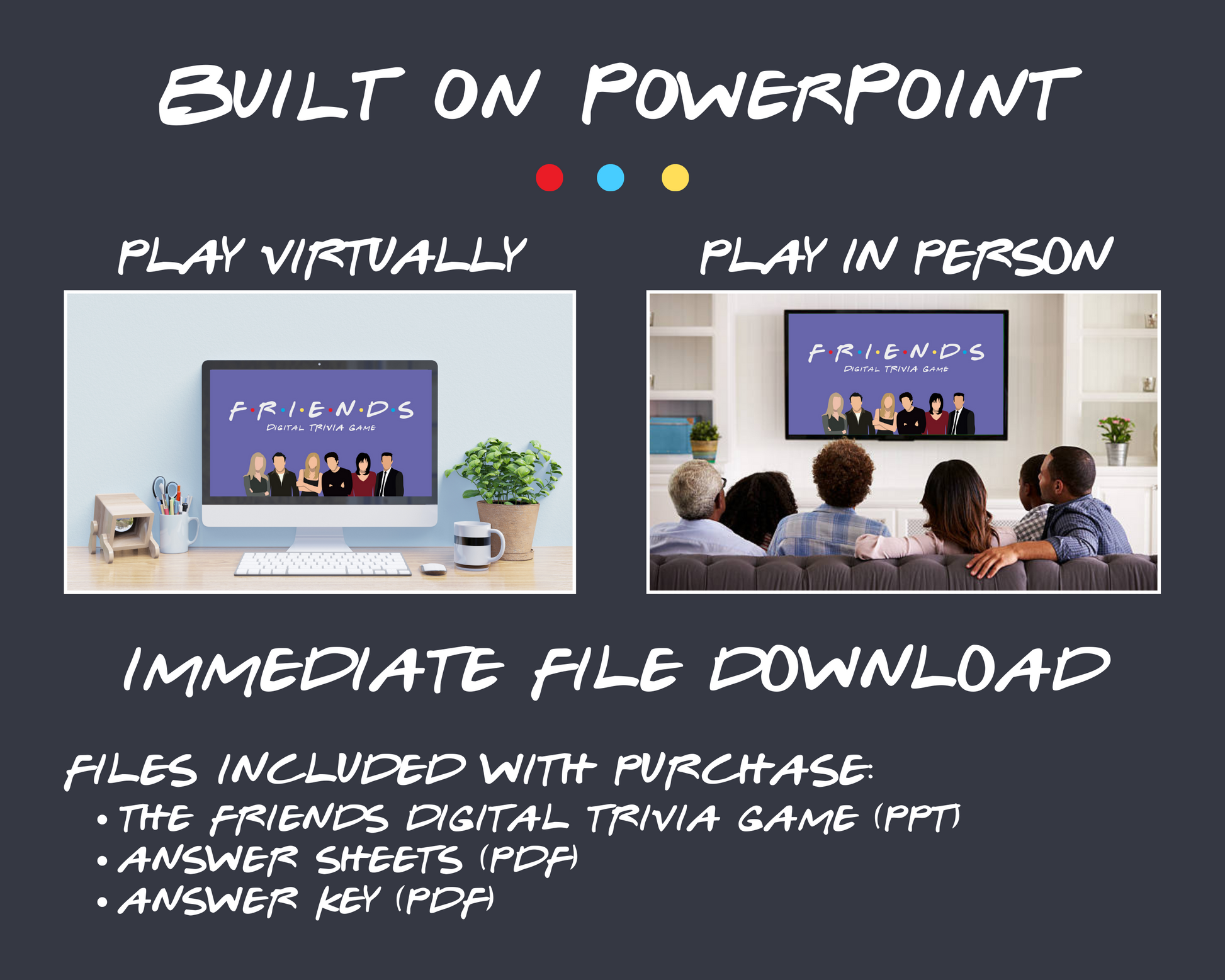 The Friends Digital Trivia Game is built on PowerPoint and includes sounds, images, and animations that will make you and your friends feel like you are sitting at Central Perk enjoying a cup of coffee!
