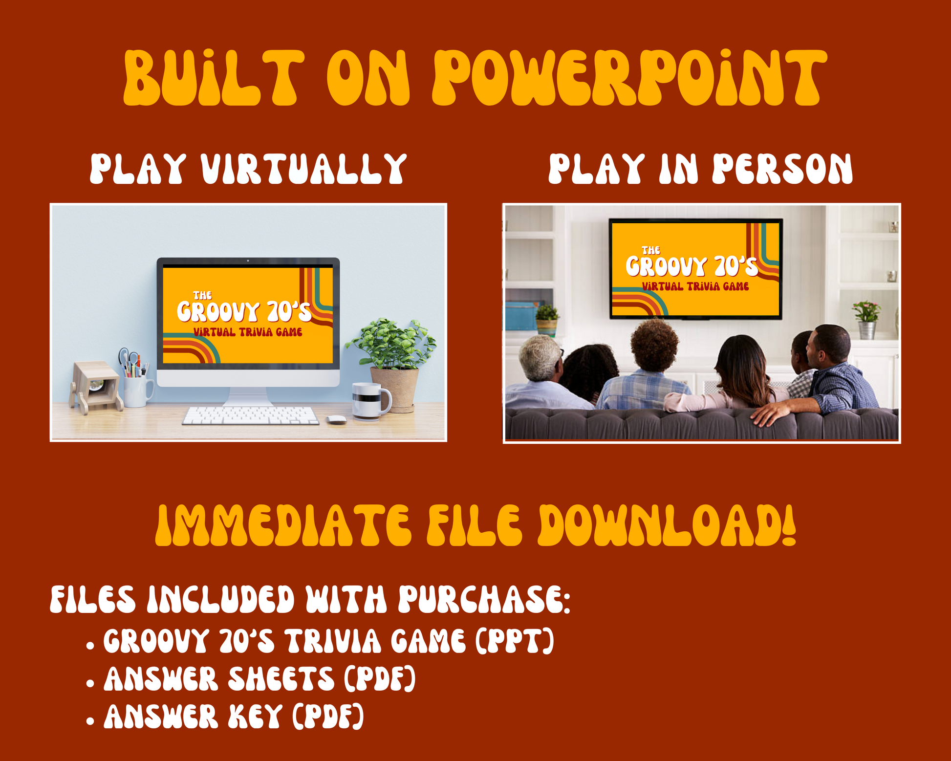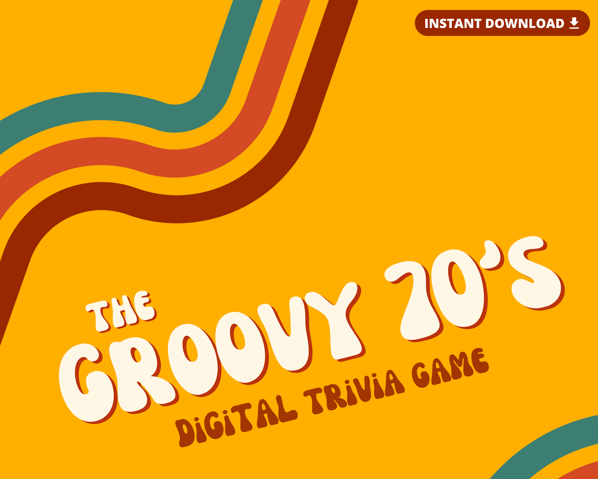 This game is built on PowerPoint and includes music and animations that will get everyone in the 70’s spirit! So go grab your best headband, some platform shoes, and a pair of bellbottom jeans and play this 70’s Trivia Game at your next party!
