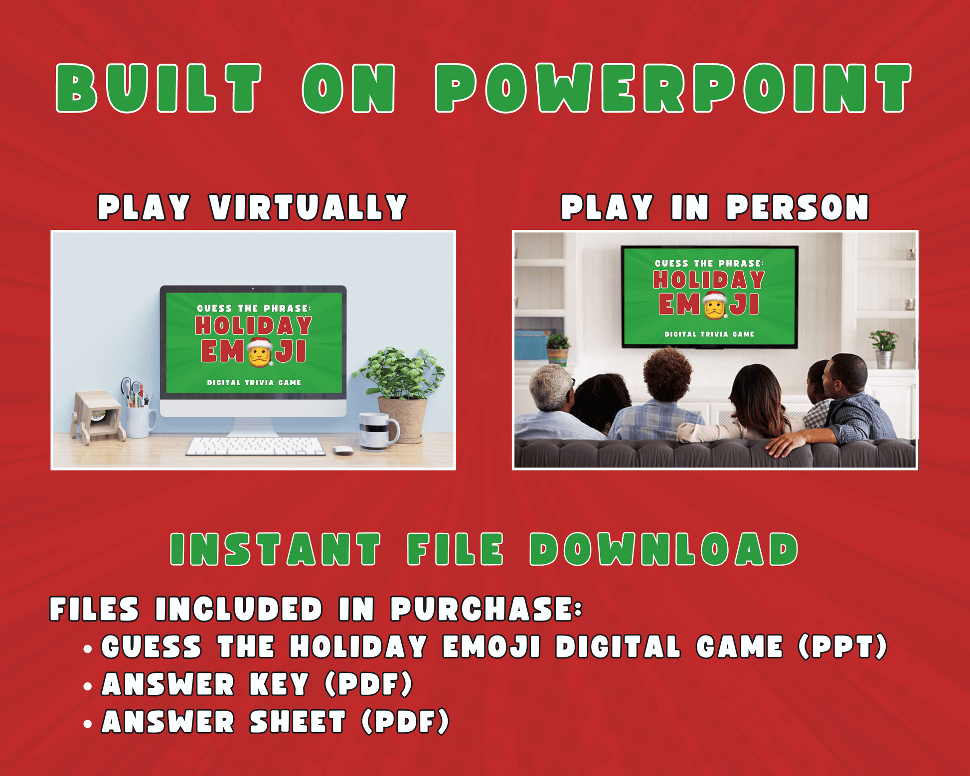 The Holiday Emoji Digital Trivia Game is the perfect way to see if you can decipher classic Holiday song and movie titles by just emoji! Perfect game for families and kid's holiday/Christmas parties!