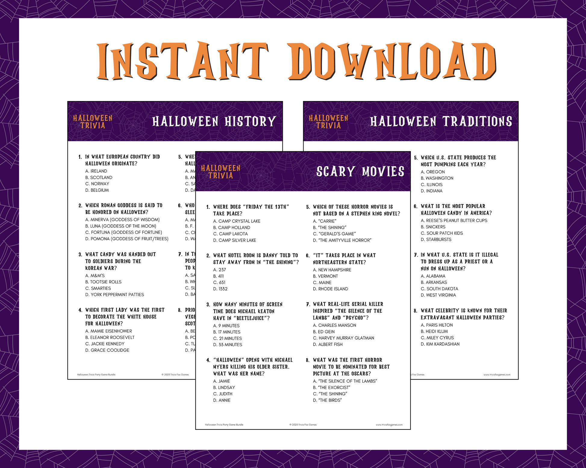 Looking to add some fun to your Halloween Party? This printable game bundle consists of five fun trivia games that will test your knowledge on the history of Halloween, scary movies, Halloween traditions and more!