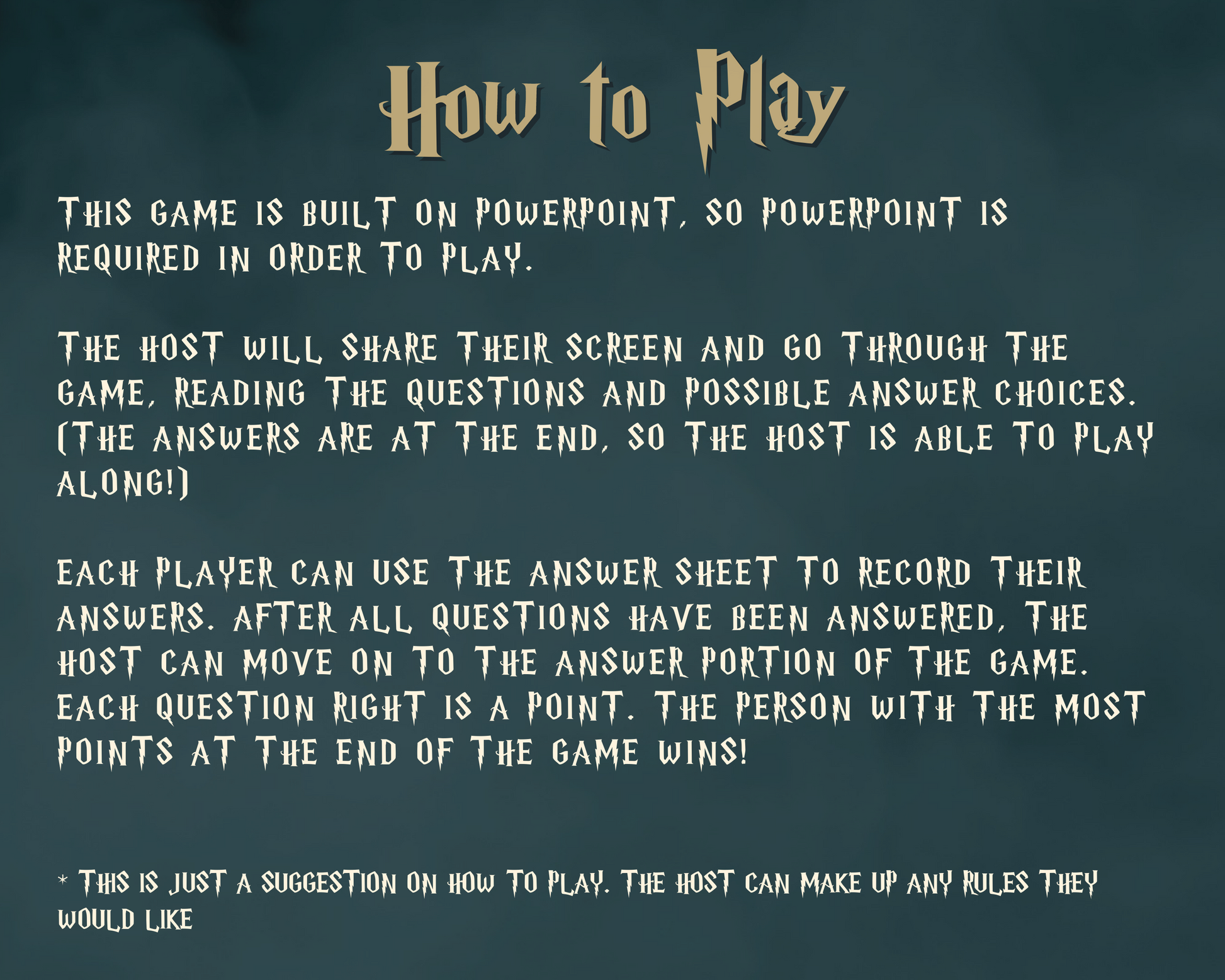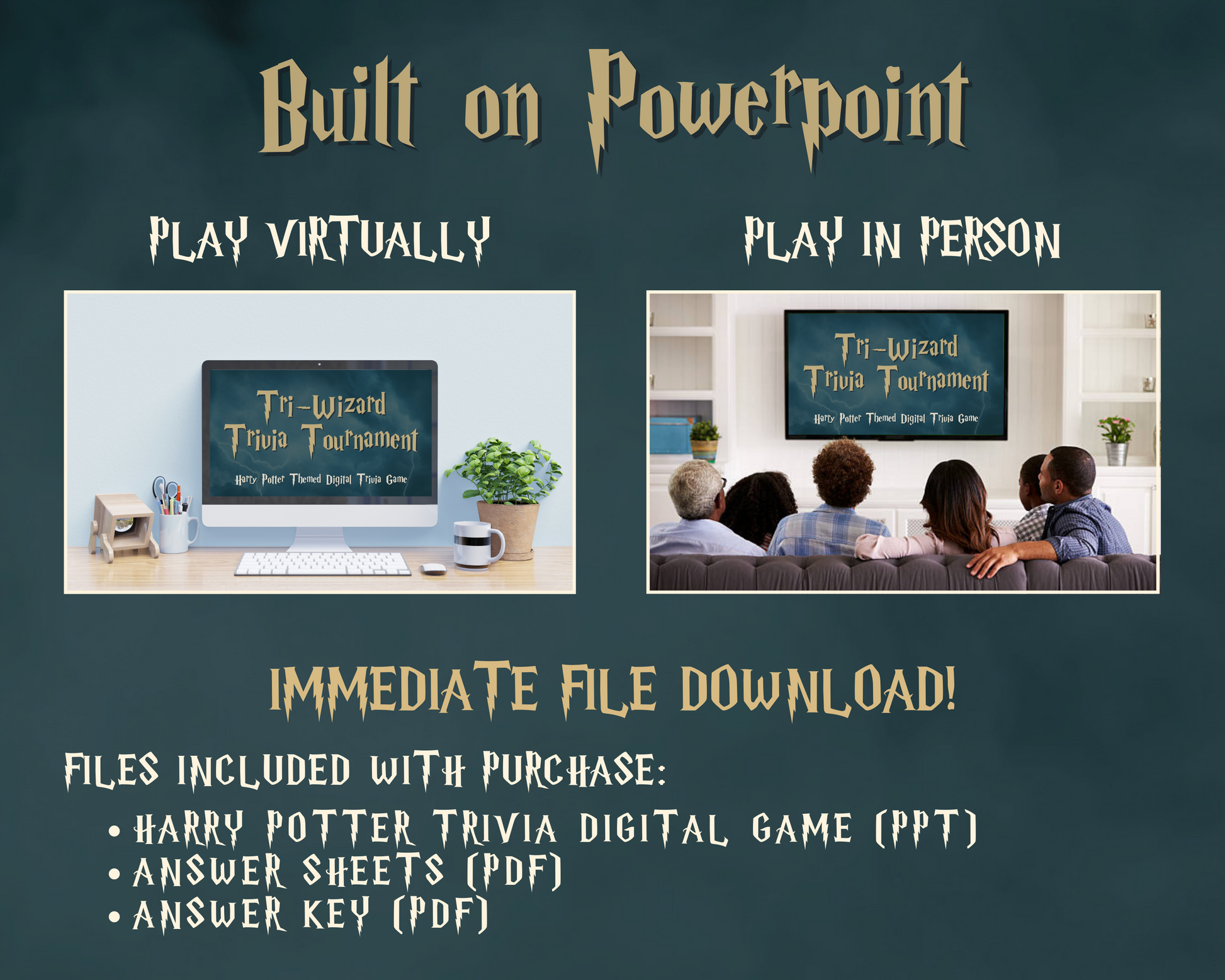 The Tri-Wizard Trivia Tournament is the perfect game to test your knowledge on everything Harry Potter! Built on PowerPoint, play in person or virtually!