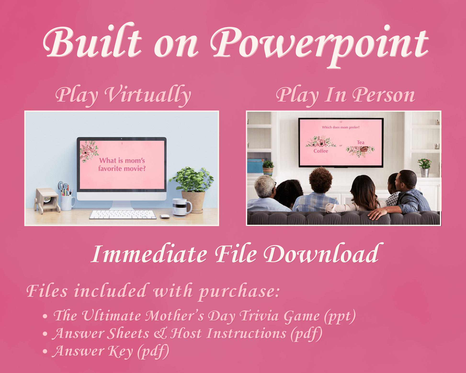 The Ultimate Mother's Day Digital Party Game is the perfect way to see how much you really know about your mom! This game is built on PowerPoint and is customizable and can be played in person or virtually!