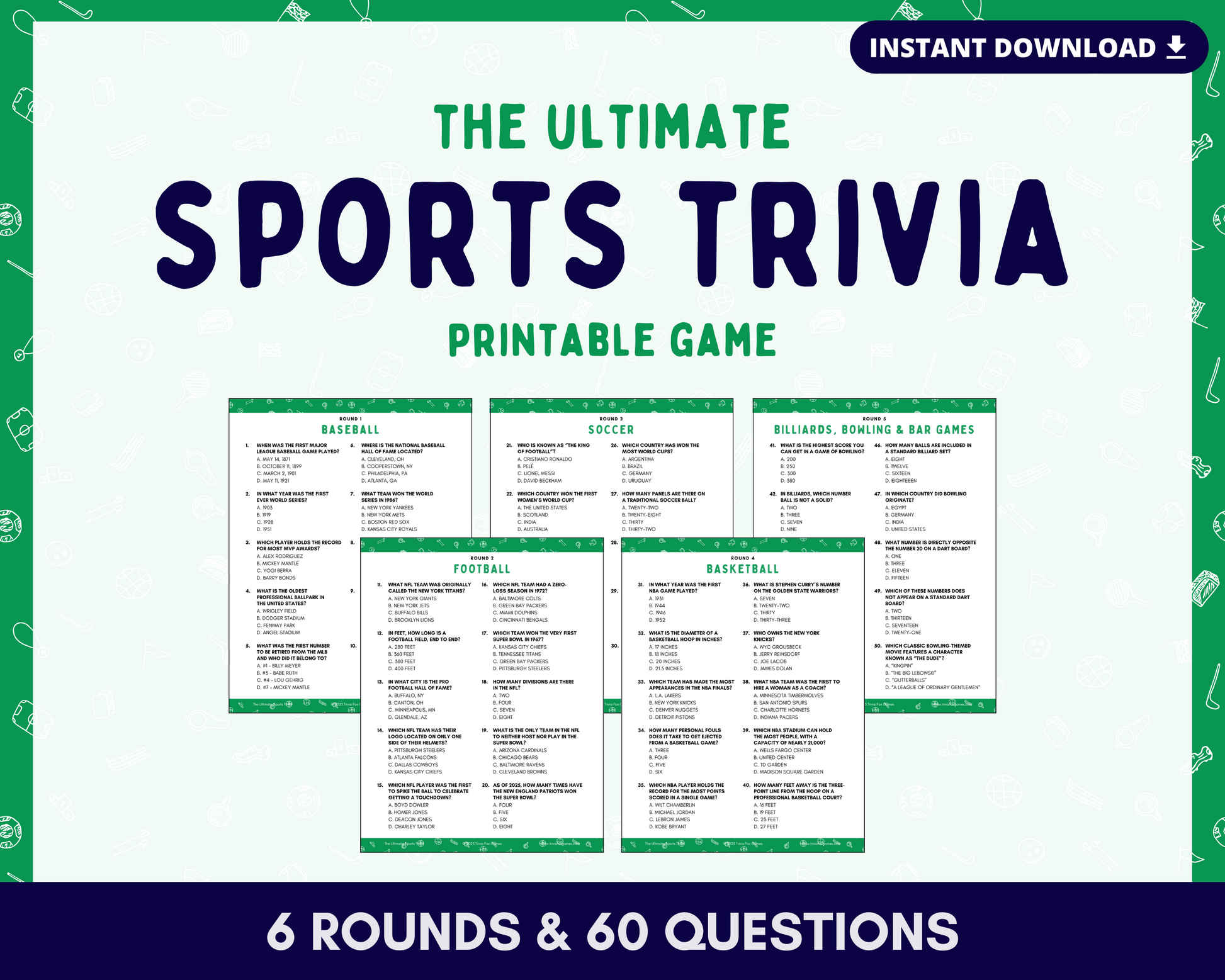 The Ultimate Sports Trivia Printable Game is the perfect game to test your knowledge baseball, football, soccer, basketball and more!