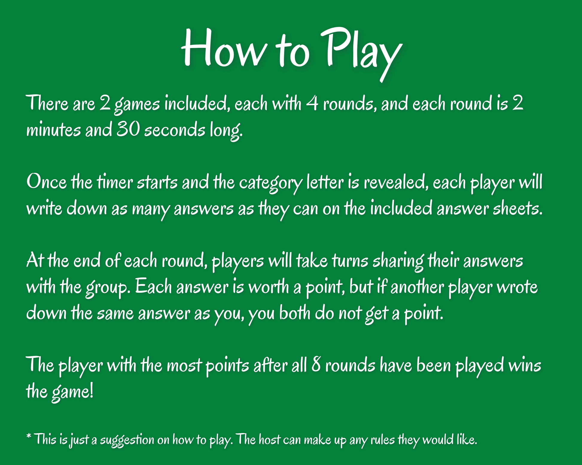 There are two games included (each with 4 rounds): LUCK and GOLD. Categories and chosen letter is already programmed into the game, but the slides are editable if needed!