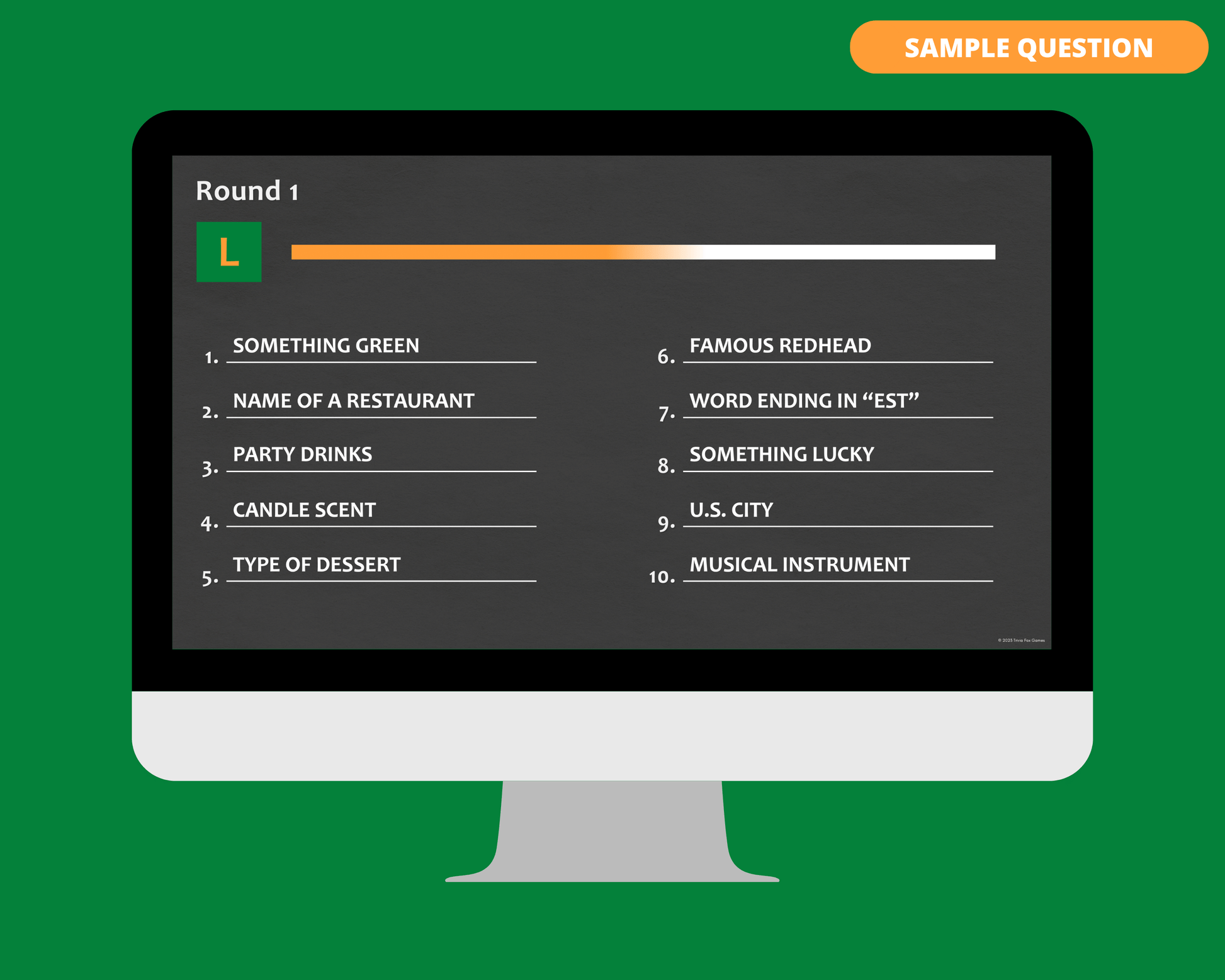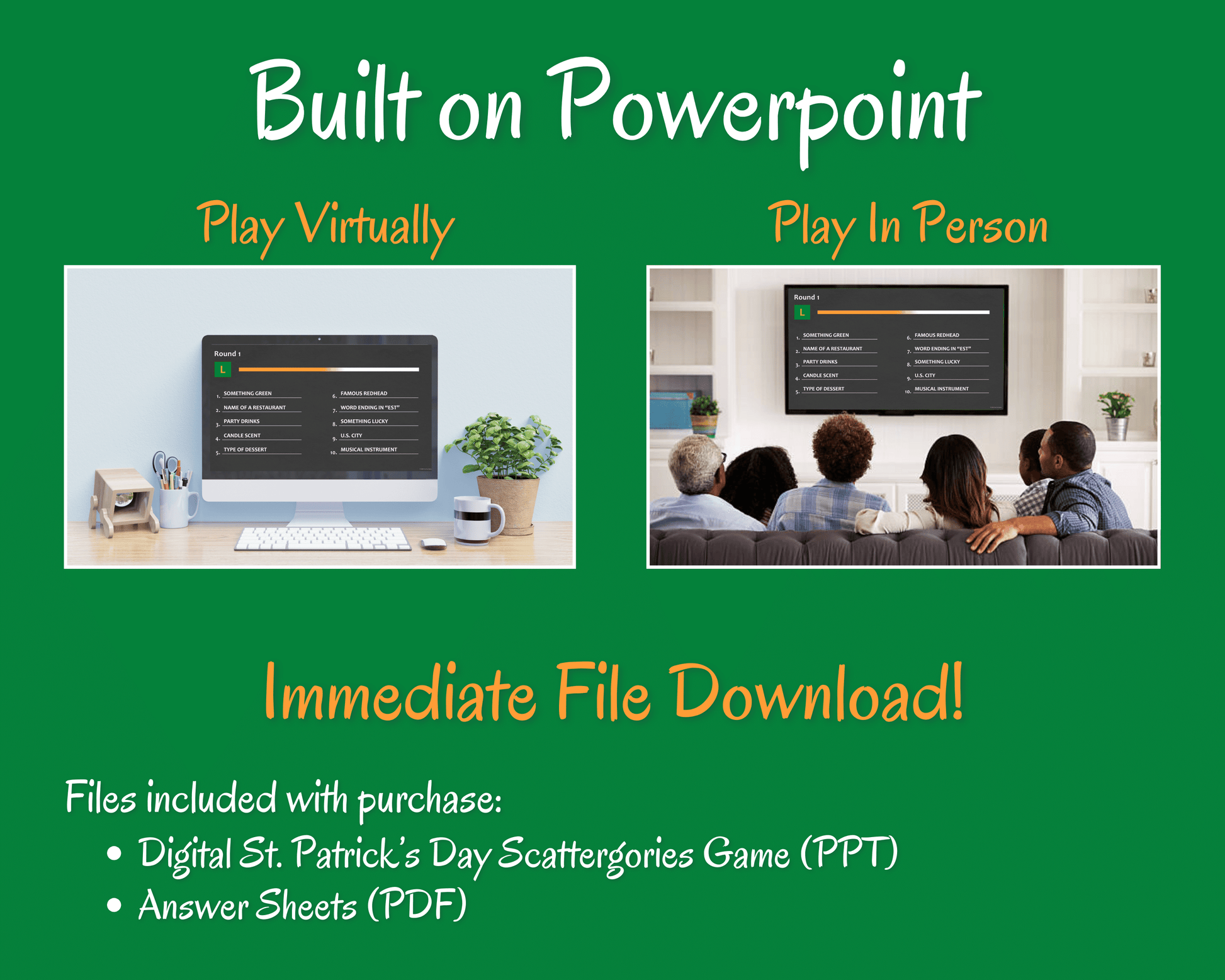 The St. Patrick's Scattergories Digital Game is PowerPoint-based, complete with sounds and animations, and can be played either virtually or in-person by the whole family!