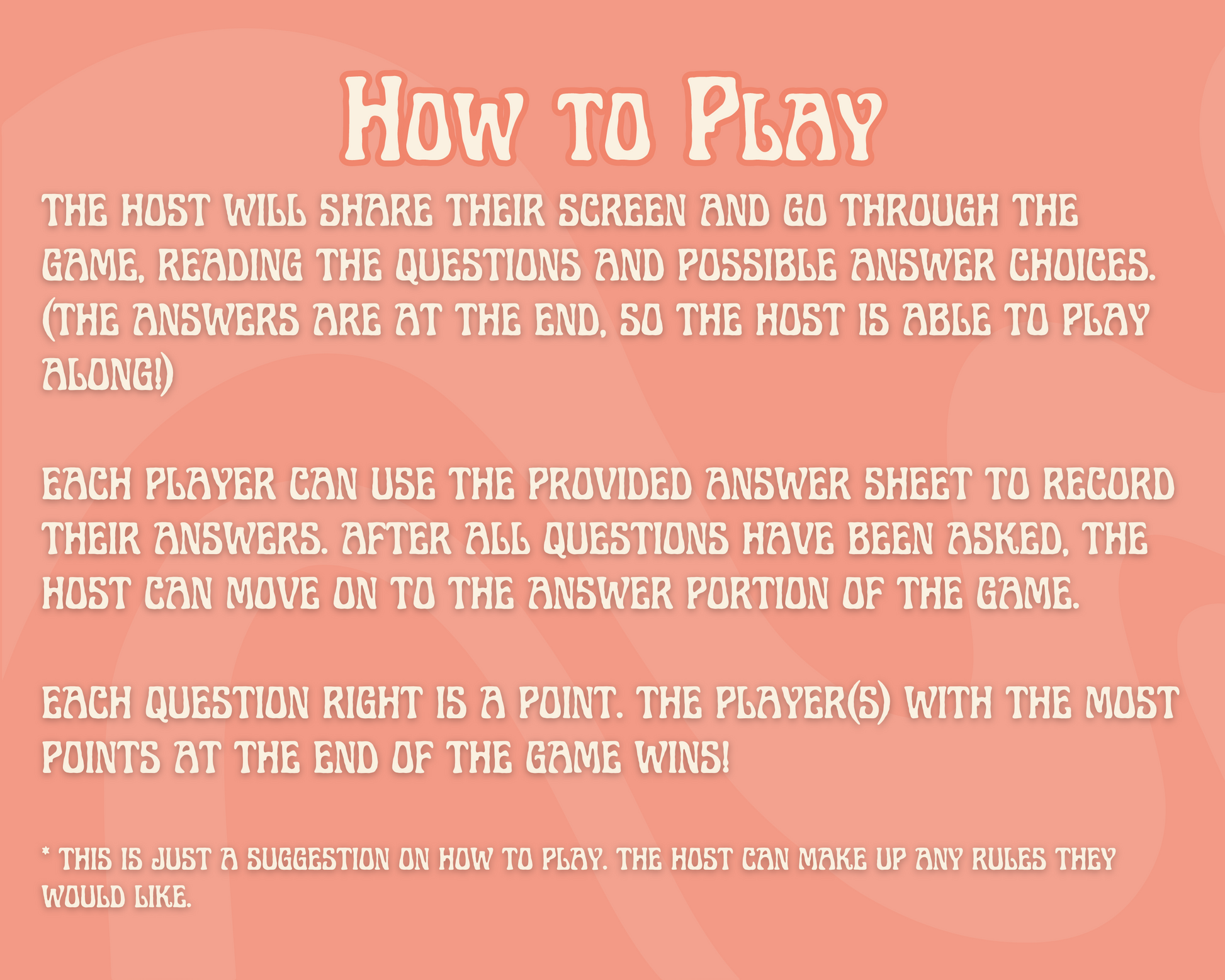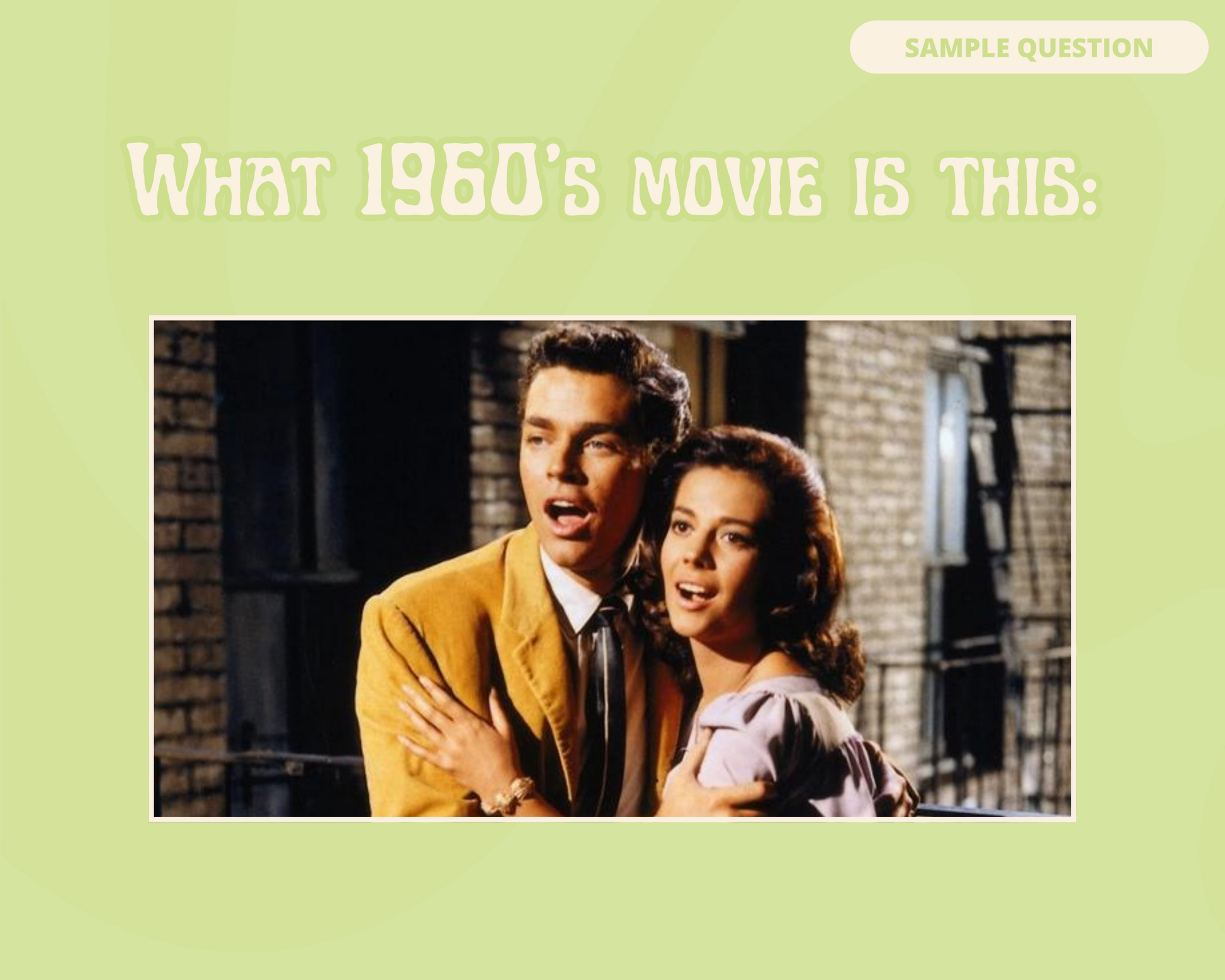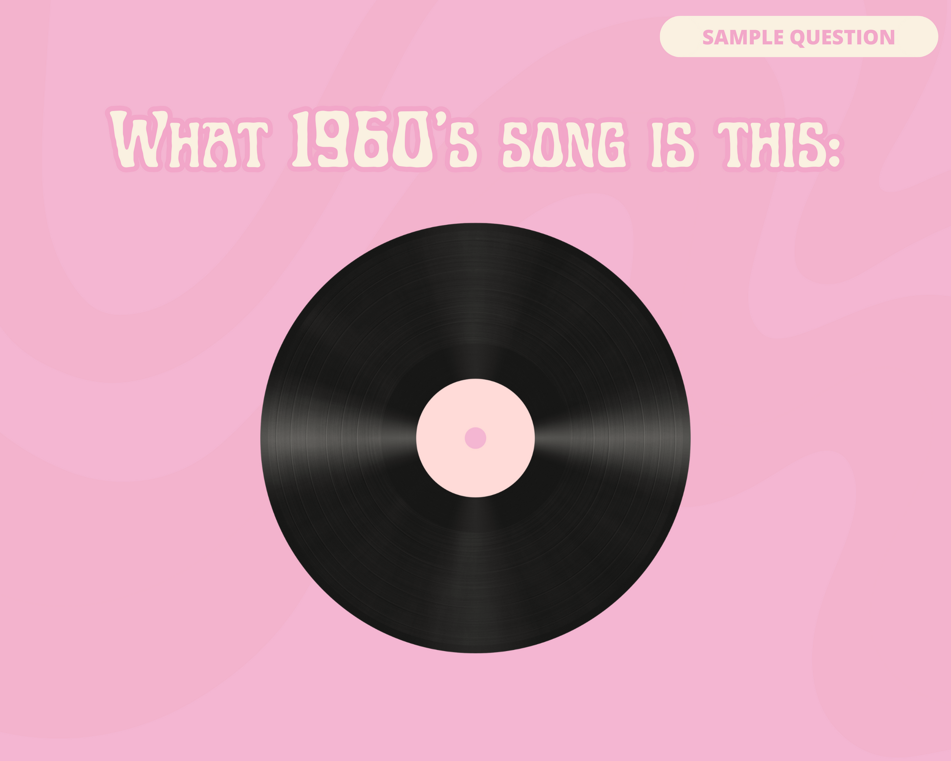 This game is built on PowerPoint (can be played virtually or in-person) and includes music and animations that will get everyone in the 60’s spirit!