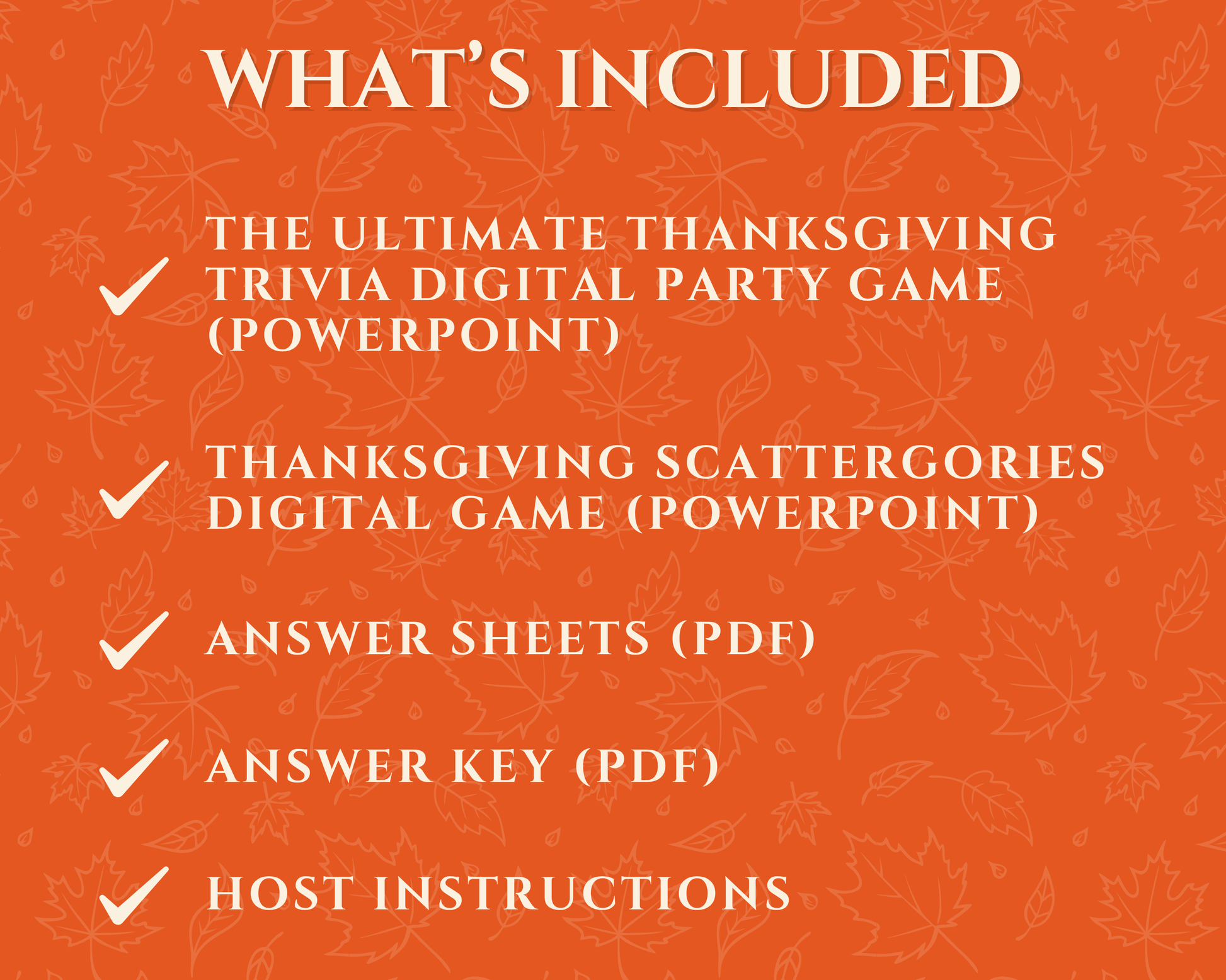Test your Thanksgiving knowledge with the Ultimate Thanksgiving Trivia Digital Game and see how many Thanksgiving-themed categories you can name with the Thanksgiving Scattergories Digital Game!