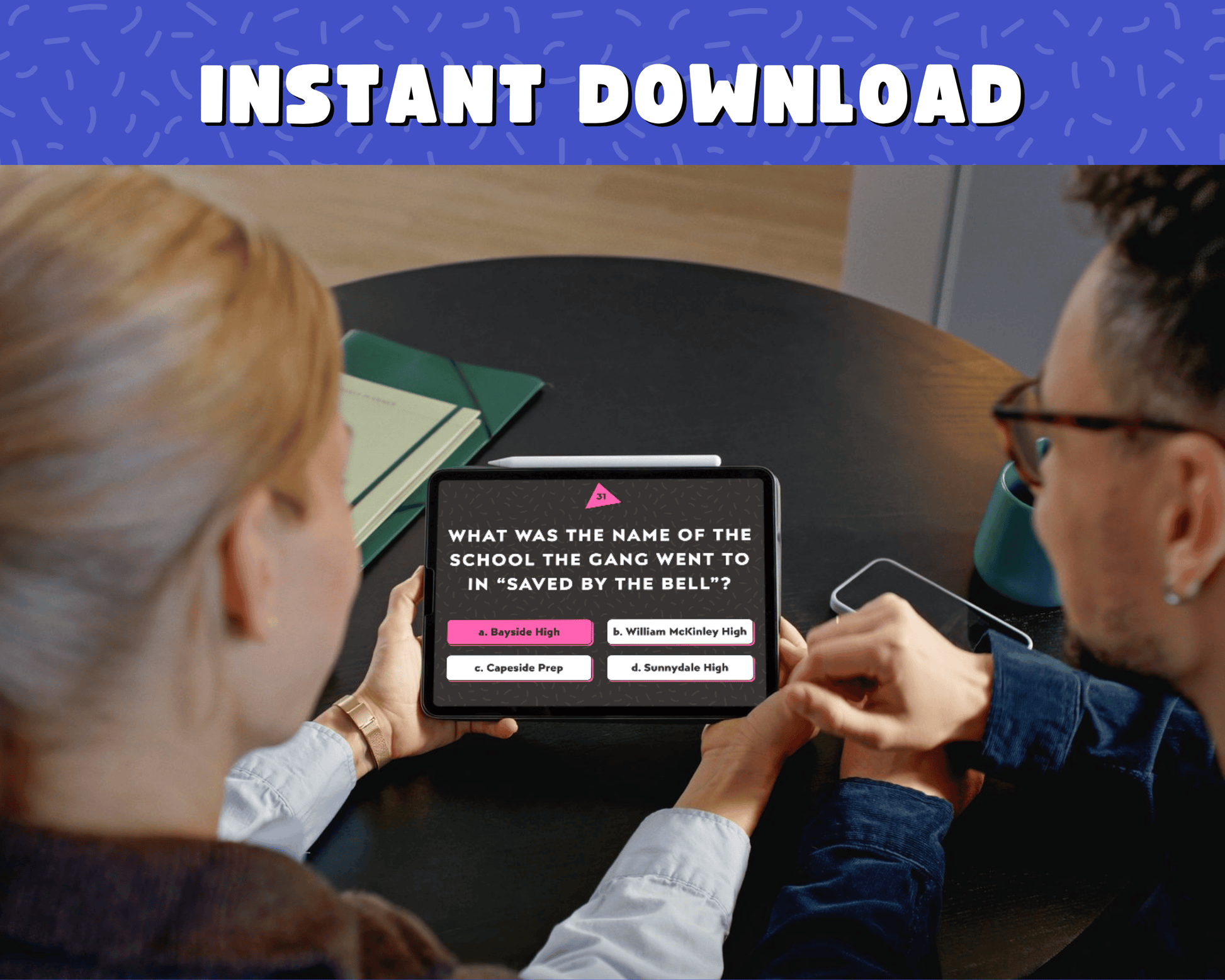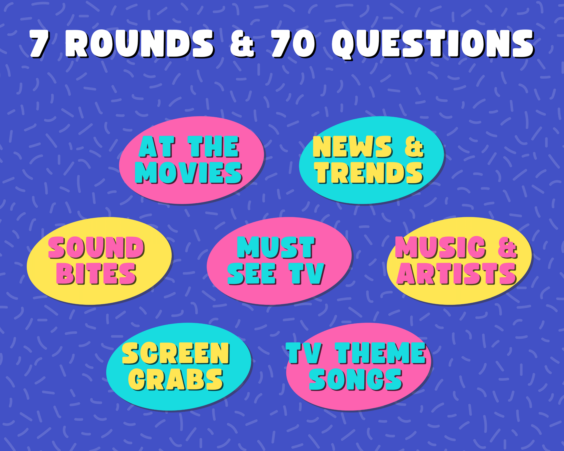 This game is perfect for 90’s themed birthday parties, in-person or virtual trivia nights, office team building, and more!